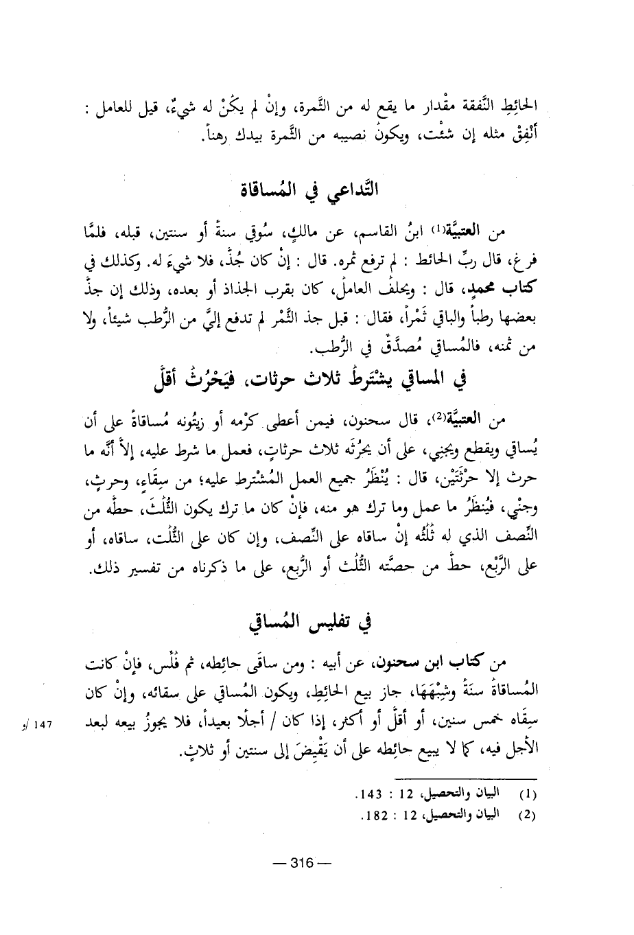 من كتاب ابن سحنون، عن أبيه: ومن ساقى حائطه، ثم فلس، فإن كانت المساقاة سنة وشبهها، جاز بيع الحائط، ويكون المساقي على سقائه، وإن كان سقاه خمس سنين، أو أقل أو أكثر، إذا كان / أجلا بعيدا، فلا يجوز بيعه لبعد الأجل فيه، كما لا يبيع حائطه على أن يقبض إلى سنتين أو ثلاث.