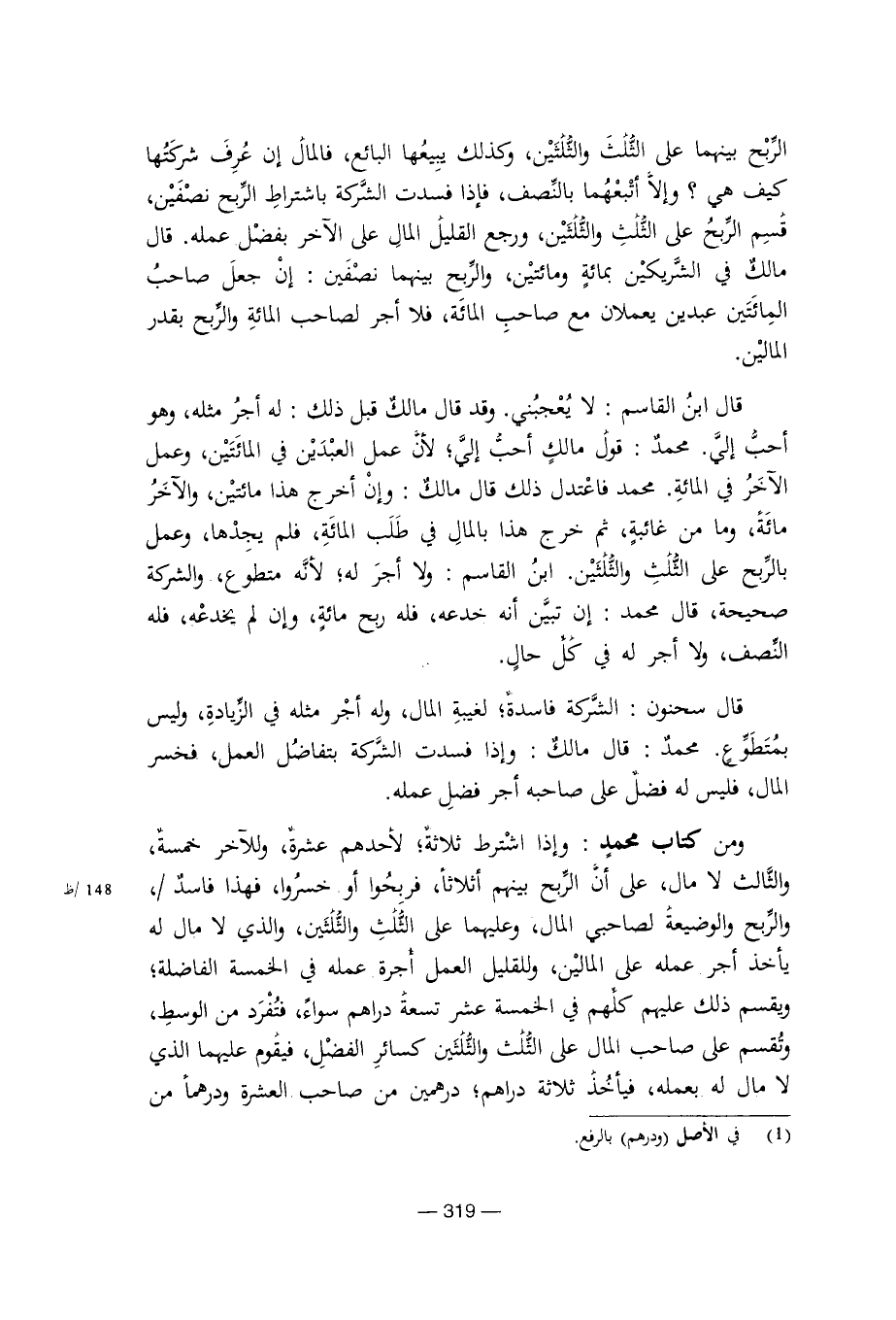 الربح بينهما على الثلث والثلثين، وكذلك يبيعها البائع، فالمال إن عرف شركتها كيف هي؟ وإلا أتبعهما بالنصف، فإذا فسدت الشركة باشتراط الربح نصفين، قسم الربح على الثلث والثلثين، ورجع القليل المال على الآخر بفضل عمله. قال مالك في الشريكين بمائة ومائتين، والربح بينهما نصفين: إن جعل صاحب المائتين عبدين يعملان مع صاحب المائة، فلا أجر لصاحب المائة والربح بقدر المالين.