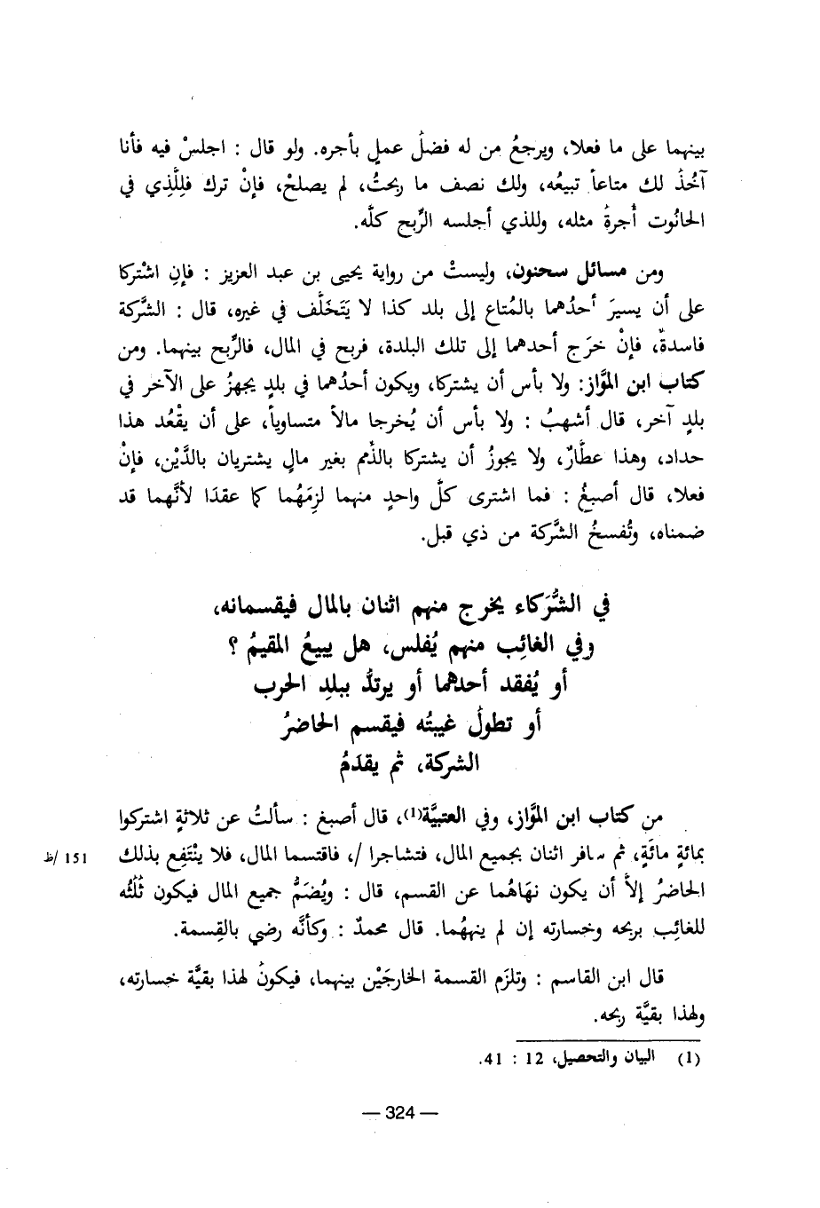 ومن مسائل سحنون، وليست من رواية يحيى بن عبد العزيز: فإن اشتركا على أن يسير أحدهما بالمتاع إلى بلد كذا لا يتخلف في غيره، قال: الشركة فاسدة، فإن خرج أحدهما إلى تلك البلدة، فربح في المال، فالربح بينهما. ومن كتاب ابن المواز: ولا بأس أن يشتركا، ويكون أحدهما في بلد يجهز على الآخر في بلد آخر، قال أشهب: ولا بأس أن يخرجا مالا متساويا، على أن يقعد هذا حداد، وهذا عطار، ولا يجوز أن يشتركا بالذمم بغير مال يشتريان بالدين، فإن فعلا، قال أصبغ: فما اشترى كل واحد منهما لزمهما كما عقدا لأنهما قد ضمناه، وتفسخ الشركة من ذي قبل.