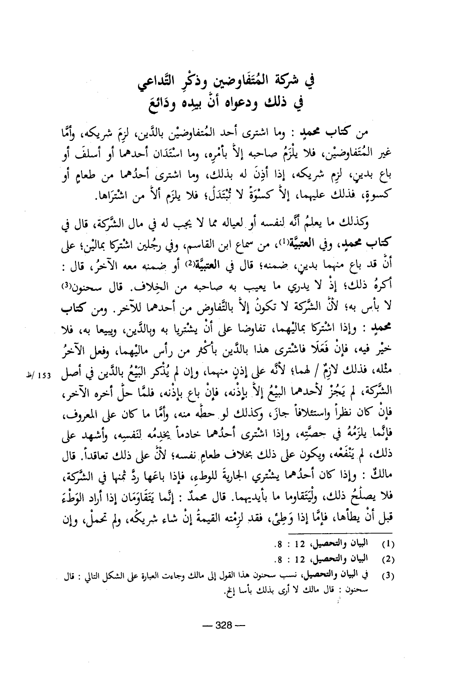 وكذلك ما يعلم أنه لنفسه أو لعياله مما لا يجب له في مال الشركة، قال في كتاب محمد، وفي العتبية، من سماع ابن القاسم، وفي رجلين اشتركا بمالين؛ على أن قد باع منهما بدين، ضمنه؛ قال في العتبية أو ضمنه معه الآخر، قال: أكره ذلك؛ إذ لا يدري ما يعيب به صاحبه من الخلاف. قال سحنون لا بأس به؛ لأن الشركة لا تكون إلا بالتفاوض من أحدهما للآخر. ومن كتاب محمد: وإذا اشتركا بماليهما، تفاوضا على أن يشتريا به وبالدين، ويبيعا به، فلا خير فيه، فإن فعلا فاشترى هذا بالدين بأكثر من رأس ماليهما، وفعل الآخر مثله، فذلك لازم / لهما؛ لأنه على إذن منهما، وإن لم يذكر البيع بالدين في أصل الشركة، لم يجز لأحدهما البيع إلا بإذنه، فإن باع بإذنه، فلما حل آخره الآخر، فإن كان نظرا واستئلافا جاز، وكذلك لو حطه منه، وأما ما كان على المعروف، فإنما يلزمه في حصته، وإذا اشترى أحدهما خادما يخدمه لنفسه، وأشهد على ذلك، لم ينفعه، ويكون على ذلك بخلاف طعام نفسه؛ لأن على ذلك تعاقدا. قال مالك: وإذا كان أحدهما يشتري الجارية للوطء، فإذا باعها رد ثمنها في الشركة، فلا يصلح ذلك، وليتقاوما ما بأيدهما. قال محمد: إنما يتقاومان إذا أراد الوطء قبل أن يطأها، فأما إذا وطئ، فقد لزمته القيمة إن شاء شريكه، ولم تحمل، وإن