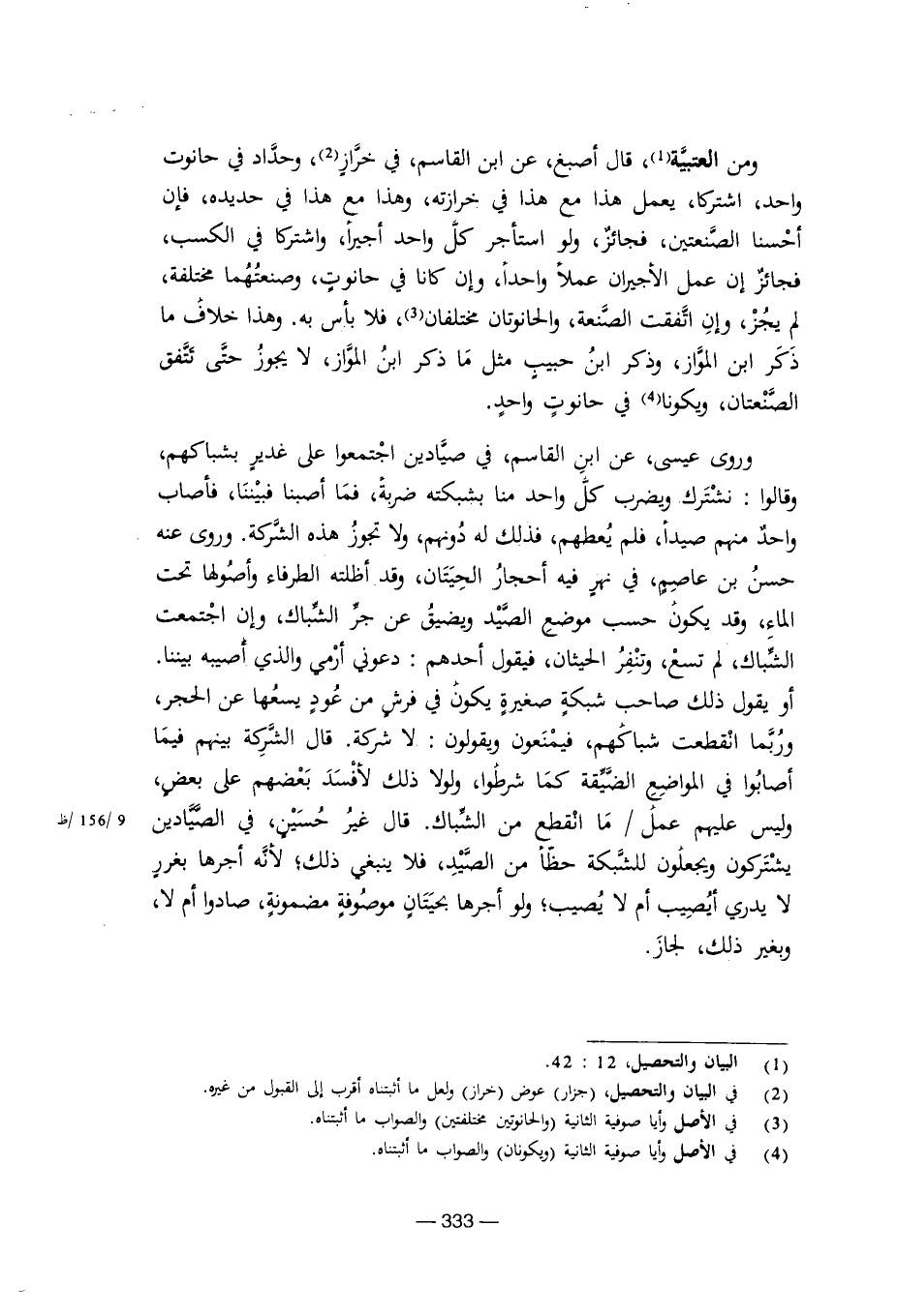 أو يقول ذلك صاحب شبكة صغيرة يكون في فرش من عود يسعها عن الحجر، وربما انقطعت شباكهم، فيمنعون ويقولون: لا شركة. قال الشركة بينهم فيما أصابوا في المواضع الضيقة كما شرطوا، ولولا ذلك لأفسد بعضهم على بعض، وليس عليهم عمل / ما انقطع من الشباك. قال غير حسين، في الصيادين يشتركون ويجعلون للشبكة حظا من الصيد، فلا ينبغي ذلك؛ لأنه أجرها بغرر لا يدري أيصيب أم لا يصيب؛ ولو أجرها بحيتان موصوفة مضمونة، صادوا أم لا، وبغير ذلك، لجاز.