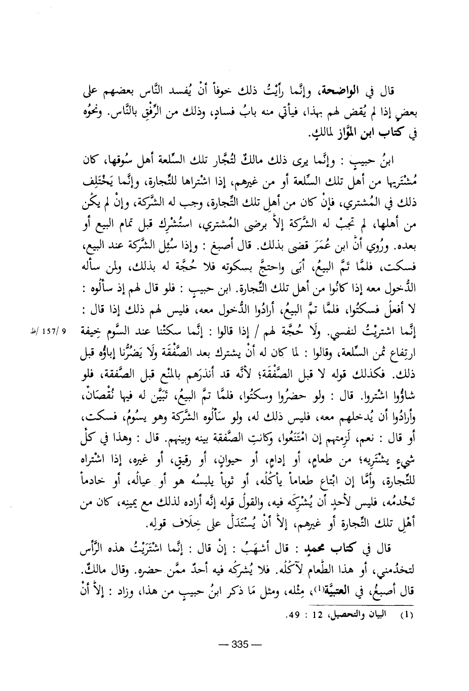 ابن حبيب: وإنما يرى ذلك مالك لتجار تلك السلعة أهل سوقها، كان مشتريها من أهل تلك السلعة أو من غيرهم، إذا اشتراها للتجارة، وإنما يختلف ذلك في المشتري، فإن كان من أهل تلك التجارة، وجب هل الشركة، وإن لم يكن من أهلها، لم تجب له الشركة إلا برضى المشتري، استشرك قبل تمام البيع أو بعده. وروي أن ابن عمر قضى بذلك. قال أصبغ: وإذا سئل الشركة عند البيع، فسكت، فلما تم البيع، أبى واحتج بسكوته فلا حجة له بذلك، ولم سأله الدخول معه إذا كانوا من أهل تلك التجارة. ابن حبيب: فلو قال لهم إذ سألوه: لا أفعل فسكتوا، فلما تم البيع، أرادوا الدخول معه، فليس لهم ذلك إذا قال: إنما أشتريت لنفسي. ولا حجة لهم / إذا قالوا: إنما سكتنا عند السوم خيفة ارتفاع ثمن السلعة، وقالوا: لما كان له أن يشترك بعد الصفقة ولا يضرنا إباؤه قبل ذلك. فكذلك قوله لا قبل الصفقة؛ لأنه قد أنذرهم بالمنع قبل الصفقة، فلو شاءوا اشتروا. قال: ولو حضروا وسكتوا، فلما تم البع، تبين له فيها نقصان، وأرادوا أن يدخلهم معه، فليس ذلك له، ولو سألوه الشركة وهو يسوم، فسكت، أو قال: نعم، لزمتهم إن امتنعوا، وكانت الصفقة بينه وبينهم. قال: وهذا في كل شيء يشتريه؛ من طعام، أو إدام، أو حيوان، أو رقيق، أو غيره، إذا اشتراه للتجارة، وأما إن ابتاع طعاما يأكله، أو ثوبا يلبسه هو أو عياله، أو خادما تخدمه، فليس لأحد أن يشركه فيه، والقول قول إنه أراده لذلك مع يمينه، كان من أهل تلك التجارة أو غيرهم، إلا أن يستدل على خلاف قوله.