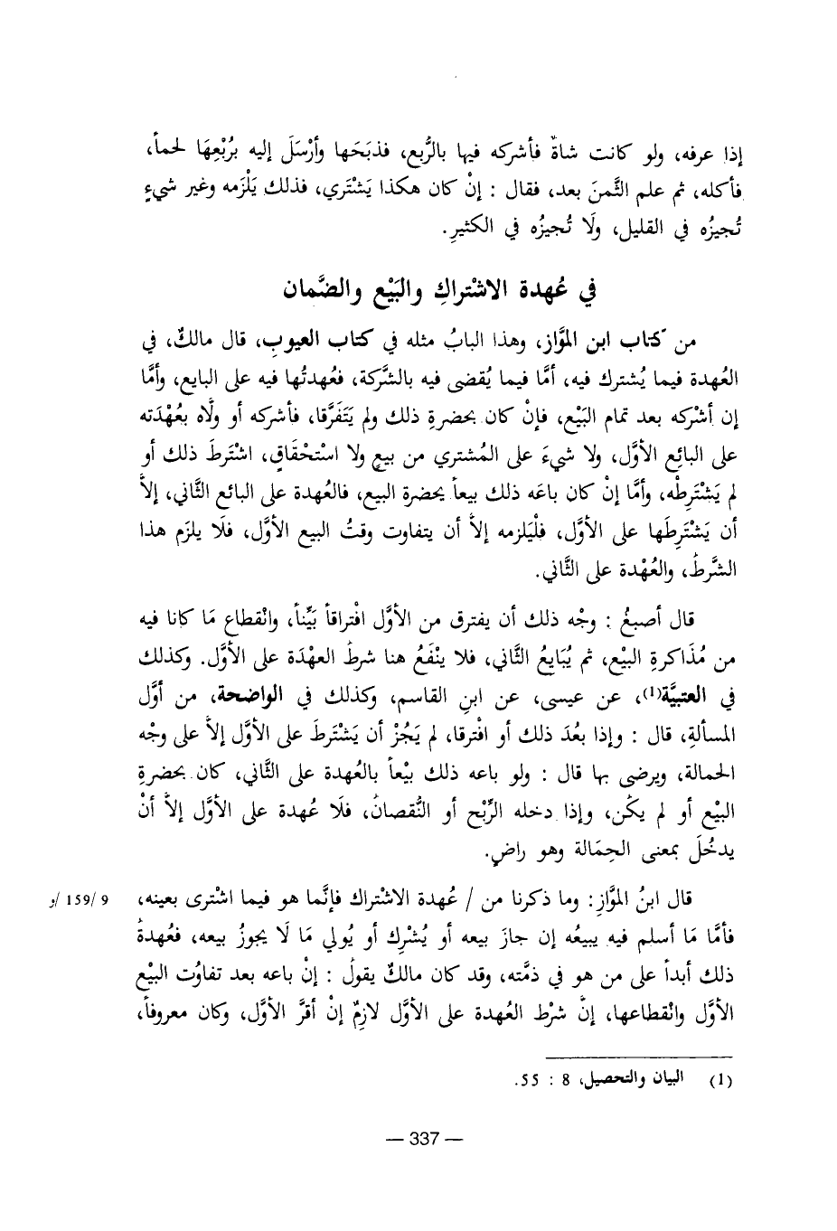 من كتاب ابن المواز، وهذا الباب مثله في كتاب العيوب، قال مالك، في العهدة فيما يشترك فيه، أما فيما يقضي فيه بالشركة، فعهدتها فيه على البايع، وأما إن أشركه بعد تمام البيع، فإن كان بحضرة ولم يتفرقا، فأشركه أو ولاه بعهدته على البائع الأول، ولا شيء على المشتري من بيع ولا استحقاق، اشترط ذلك أو لم يشترطه، وأما إن كان باعه ذلك بيعا يحضرة البيع، فالعهدة على البائع الثاني، إلا أن يشترطها على الأول، فليلزمه إلا أن يتفاوت وقت البيع الأول، فلا يلزم هذا الشرط، والعهدة على الثاني.