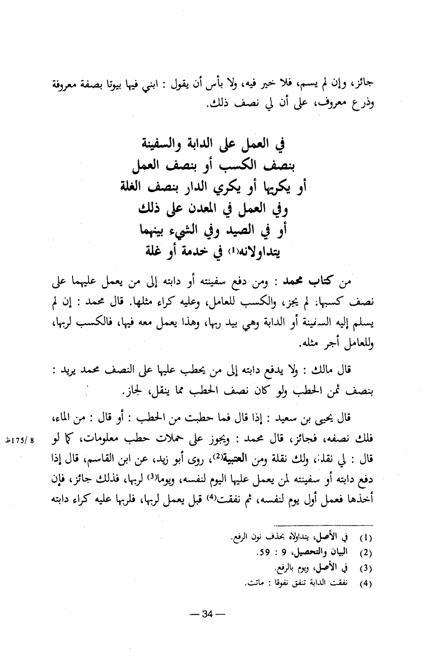 من كتاب محمد: ومن دفع سفينته أو دابته إلى من ي عمل عليهما على نصف كسبها، لم يجز، والكسب للعامل، وعليه كراء مثلها. قال محمد: إن لم يسلم إليه السفينة أو الدابة وهي بيد ربها، وهذا يعمل معه فيها، فالكسب لربها، وللعامل أجر مثله.