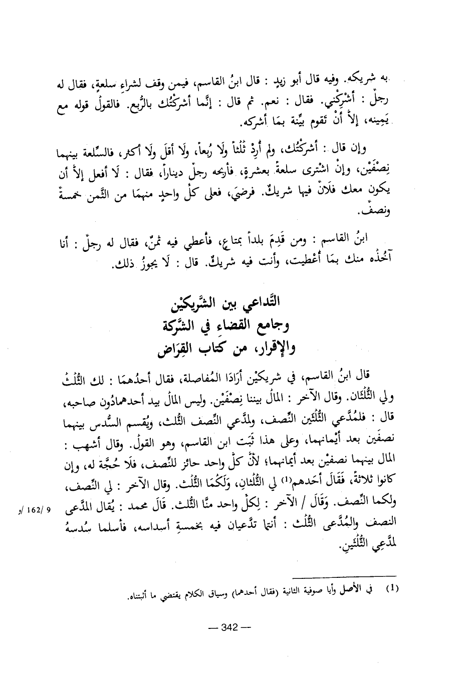 به شريكه. وفيه قال أبو زيد: قال ابن القاسم، فيمن وقف لشراء سلعة، فقال له رجل: أشركني. فقال: نعم. ثم قال: إنما أشركتك بالربع. فالقول قوله مع يمينه، إلا أن تقوم بينة بما أشركه.