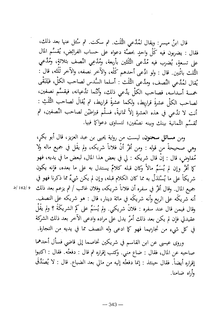 ومن مسائل سحنون، ليست من رواية يحيى بن عبد العزيز، قال أبو بكر، وهي صحيحة من قوله: ومن أقر أن فلانا شريكه، ولم يقل في جميع ماله ولا مفاوض، قال: إن قال شريكه: لي في بعض هذا المال، لبعض ما في يديه، فهو كما أقر وإن لم يسم مالا وكان قبله كلام يستدل به عى ما بعده، فإن يكون شريكا على ما يستدل به مما كان الكلام قبله، وإن لم يكن شيء مما ذكرنا فهو في جميع المال. وقال أقر في سفره أن فلانا شريكه، وفلان غائب / ثم يزعم بعد ذلك أنه شريكه على الربع وأنه شريكه في مائة دينا. قال: هو شريكه على النصف.