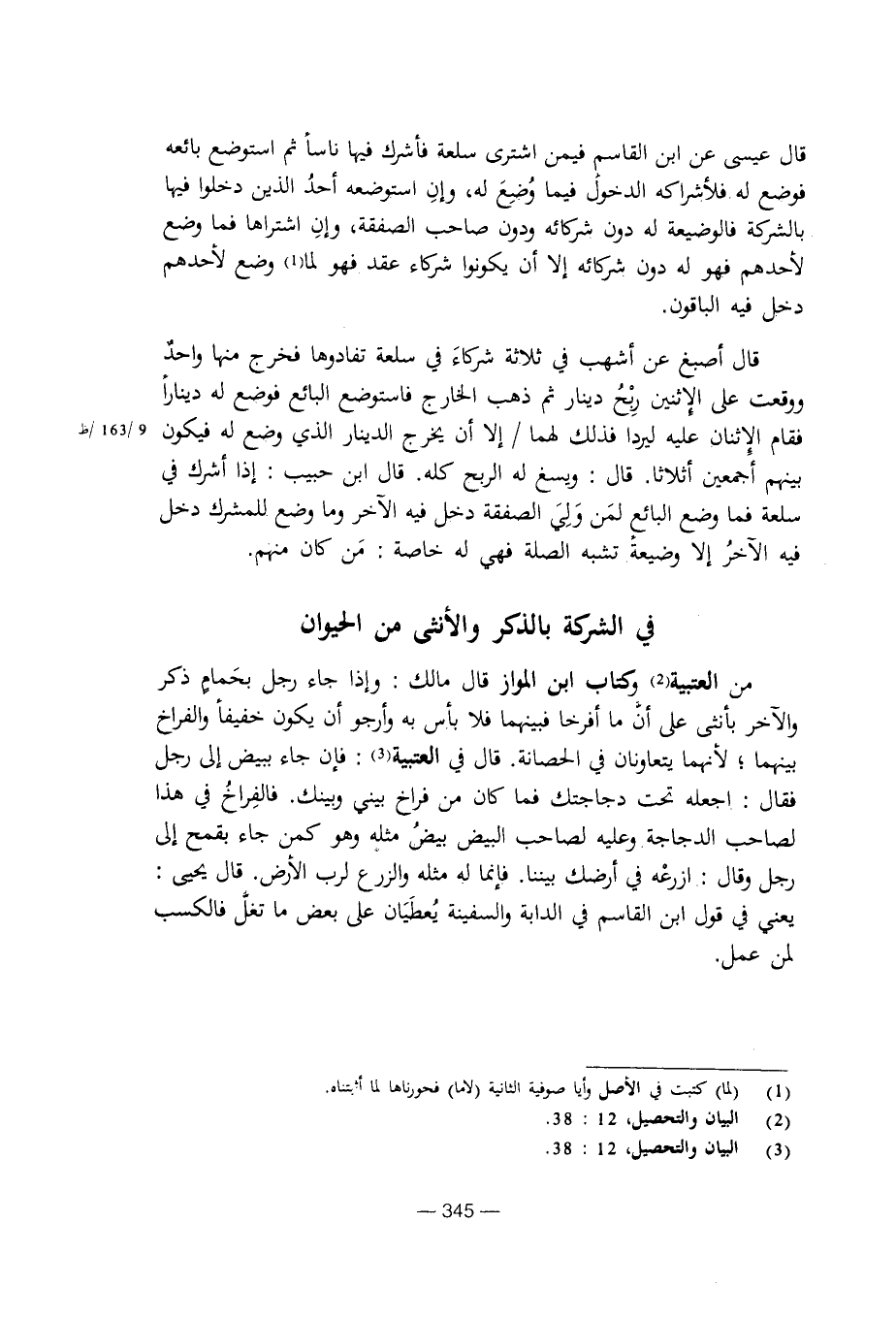 قال أصبغ عن أشهب في ثلاثة شركاء في سلعة تفادوها فخرج منها واحد ووقعت على الاثنين ربح دينار ثم ذهب الخارج فاستوضع البائع فوضع دينارا فقام الاثنان عليه ليردا فذلك لهما / إلا أن يخرج الدينار الذي وضع له فيكون بينهم أجمعين أثلاثا. قال: ويسغ له الربح كله. قال ابن حبيب: إذا أشرك في سلعة فما وضع البائع لمن ولي الصفقة دخل فيه الآخر وما وضع للمشرك دخل فيه الآخر إلا وضيعة تشبه الصلة فهي له خاصة: من كان منهم.