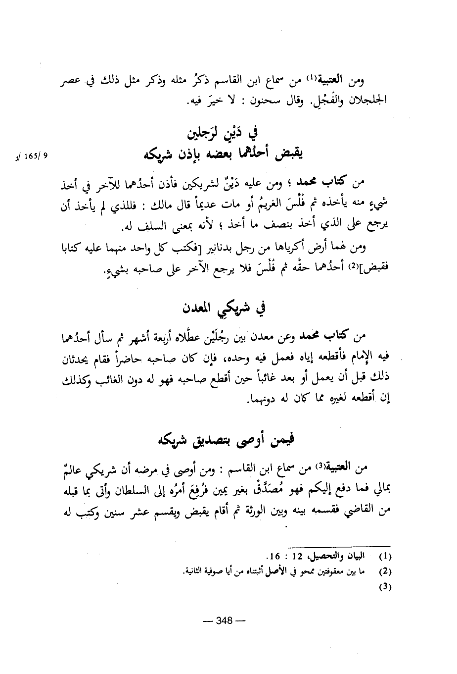 من العتبية من سماع ابن القاسم: ومن أوصى في مرضه أن شريكه عالم بالي فما دفع إليكم فهو مصدق بغير يمين ف فرفع أمره إلى السلطان وأتى بما قبله من القاضي فقسمه بينه وبين الورثة ثم أقام يقبض ويقسم عشر سنين وكتب له