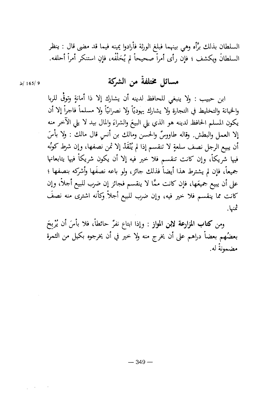 ابن حبيب: ولا ينبغي للحافظ لدينه أن يشارك إلا ذا أمانة وتوق للربا والخيانة والتخليط في التجارة ولا يشارك يهوديا ولا نصرانيا ولا مسلما فاجرا إلا أن يكون المسلم الحافظ لدينه هو الذي يلي البيع والشراء والمال بيد لا يلي الآخر منه إلا العمل والبطش. وقاله طاووس والحسن ومالك بن أنس قال مالك: ولا بأس أن يبيع الرجل نصف سلعة لا تنقسم إذا لم ينقد إلا ثمن نصفها، وإن شرط كونه فيها شريكا، وإن كانت تنقسم فلا خير فيه إلا أن يكون شريكا فيها يتابعانها جميعا، فإن لم يشترط هذا أيضا فذلك جائز، ولو باعه نصفها وأشركه بنصفها؛ على أن يبيع جميعها، فإن كانت مما لا ينقسم فجائز إن ضرب للبيع أجلا، وإن كانت مما ينقسم فلا خير فيه، وإن ضرب للبيع أجلا. وكأنه اشترى منه نصف ثمنها.