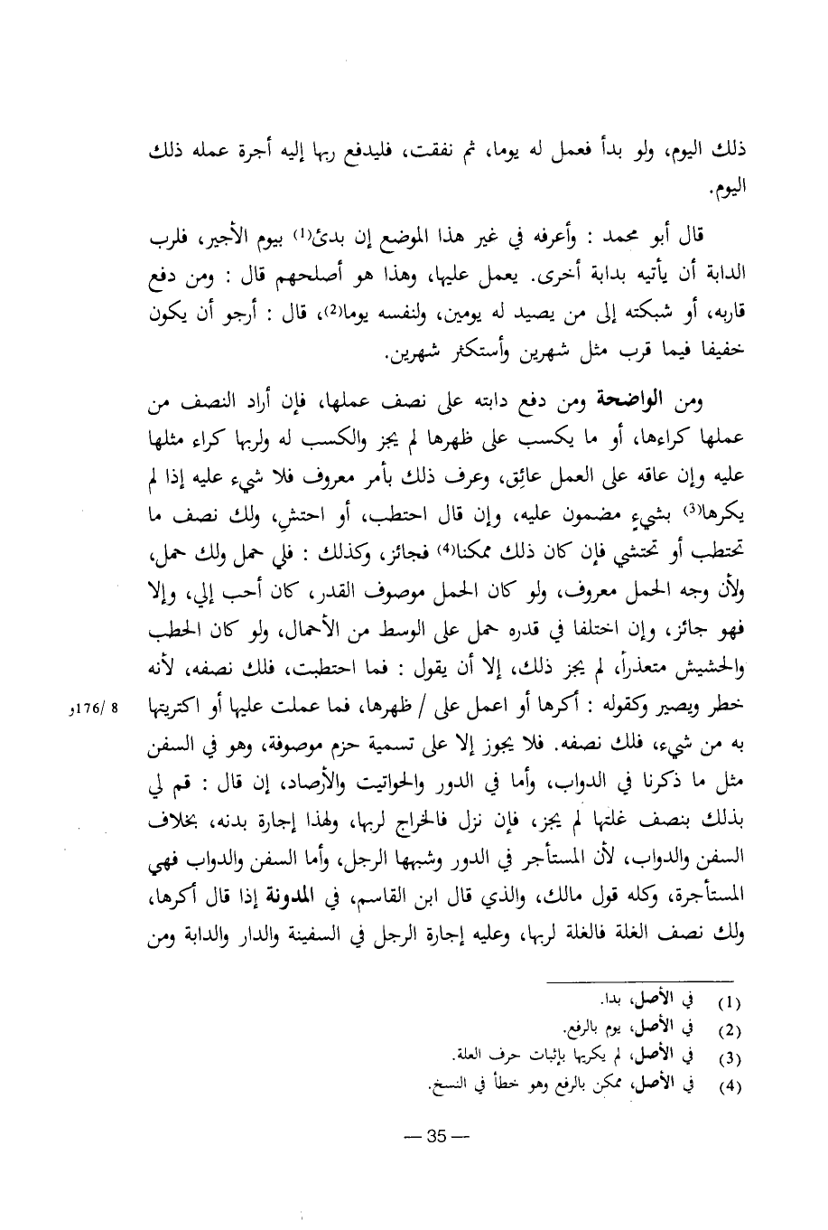 ومن الواضحة ومن دفع دابته على نصف عملها، فإن أراد النصف من عملها كراءها، أو ما يكسب على ظهرها لم يجز والكسب له ولربها كراء مثلها عليه وإن عاقه على العمل عائق، وعرف ذلك بأمر معروف فلا شيء عليه إذا لم يكرها بشيء مضمون عليه، وإن قال احتطب، أو احتش، ولك نصف ما تحتطب أو تحتشى فإن كان ذلك ممكنا فجائز، وكذلك: فلي حمل ولك حمل، ولأن وجه الحمل معروف، ولو كان الحمل موصوف القدر، كان أحب إلي، وإلا فهو جائز، وإن اختلفا في قدره حمل على الوسط من الأحمال، ولو كان الحطب والحشيش متعذرا، لم يجز ذلك، إلا أن يقول: فما احتطت، فلك نصفه، لأنه خطر ويصير وكقوله: أكرها أو اعمل على / ظهرها، فما عملت عليها أو اكتريتها به من شيء، فلك نصفه. فلا يجوز إلا على تسمية حزم موصوفة، وهو في السفن مثل ما ذكرنا في الدواب، وأما في الدرر والحواتيت والأرصاد، إن قال: قم لي بذلك بنصف غلتها لم يجز، فإن نزل فالخراج لربها، ولهذا إجارة بدنه، بخلاف السفن والدواب، لأن المستأجر في الدور وشبهها الرجل، وأما السفن والدواب فهي المستأجرة، وكله قول مالك، والي قال ابن القاسم، في المدونة إذا قال أكرها، ولك نصف الغلة فالغلة لربها، وعليه إجارة الرجل في السفينة والدار والدابة ومن