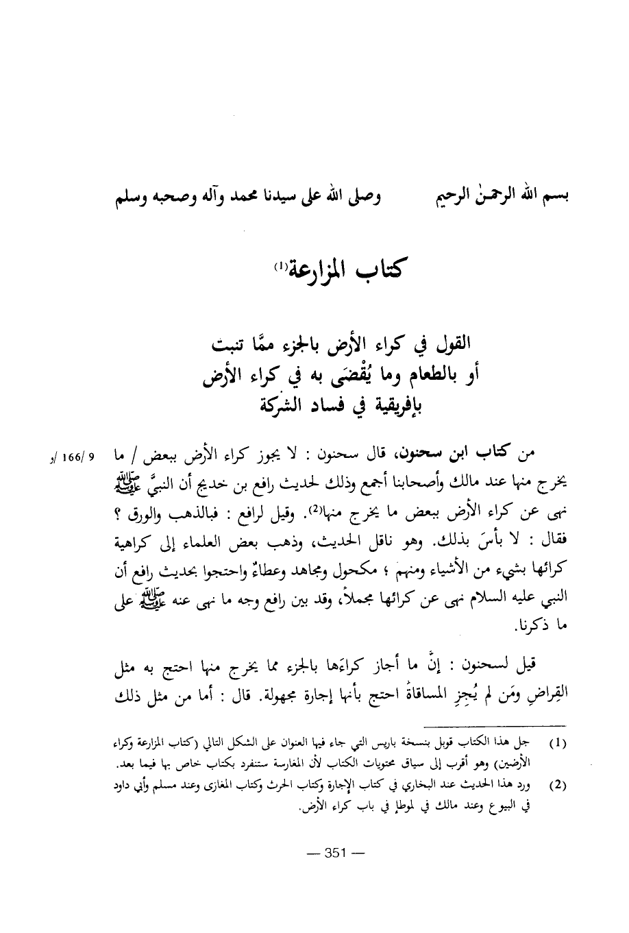 من كتاب ابن سحنون، قال سحنون: لا يجوز كراء الأرض ببعض / ما يخرج منها عند مالك وأصحابنا أجمع وذلك لحديث رافع بن خديج أن النبي صلى الله عليه وسلم نهى عن كراء الأرض ببعض ما يخرج منها. وقيل لرافع: فبالذهب والورق؟ فقال: لا بأس بذلك. وهو ناقل الحديث، وذهب بعض العلماء إلى كراهية كرائها بشيء من الأشياء ومنهم؛ مكحول ومجاهد وعطاء واحتجوا بحديث رافع أن النبي عليه السلام نهى عن كرائها مجملا، وقد بين رافع وجه ما نهى عنه صلى الله عليه وسلم على ما ذكرنا.