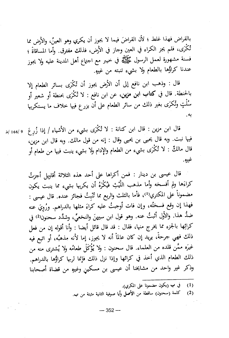 قال: وذهب ابن نافع إلى أن الأرض يجوز أن تكرى بسائر الطعام إلا بالحنطة. قال في كتاب ابن مزين، عن ابن نافع: لا تكرى بحنطة أو شعير أو سلت وتكرى بغير ذلك من سائر الطعام على أن يزرع فيها خلاف ما يستكريها به.
