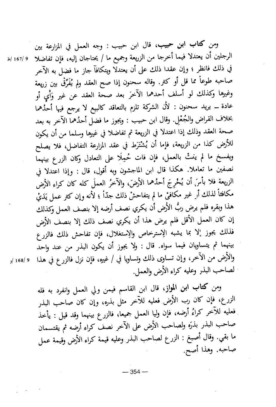 ومن كتاب ابن حبيب، قال ابن حبيب: وجه العمل في المزرعة بين الرجلين أن يعتدلا فيما أخرجا من الزريعة وجميع ما / يحتاجان إليه، فإن تفاضلا في ذلك فانظر؛ وإن عقدا ذلك على أن يعتدلا ويتكافآ جاز ما فضل به الآخر صاحبه طوعا مما قال أو كثر. وقاله سحنون إذا صح العقد ولم يفرق بين زريعغة وغيرها وكذلك لو أسلف أحدهما الآخر بعد صحة العقد عن غير وأي أو عادة ـ يريد سحنون: لأن الشركة تلزم بالتعاقد كالبيع لا يرجع فيها أحدهما بخلاف القراض والجعل. وقال ابن حبيب: ويجوز ما فضل أحدهما الآخر به بعد صحة العقد وذلك إذا اعتدلا في الزريعة ثم تفاضلا في غيرها وسلما من أن يكون للأرض كذا من الزريعة، فإما أن يشترط في عقد المزارعة التفاضل، فلا يصلح ويفسخ ما لم يفت العمل، فإن فات حملا على التعادل وكان الزرع بينهما نصفين ما تعاملا. هكذا قال ابن الماجشون وبه أقول، قال: وإذا اعتدلا في الزريعة فلا بأس أن يخرج أحدهما الأرض، والآخر العمل كله كان كراء الأرض مكافئا لذلك أو غير مكافئ ما لم يتفاحش ذلك جدا؛ لأنه وإن كثر عمل يدي هذا وبقره فلم يرض رب الأرض أن يكري نصف أرضه إلا بنصف العمل وكذلك إن أن العمل الأقل فلم يرض هذا أن يكري نصف ذلك إلا بنصف الأرض فذلك يجوز إلا بما يشبه الاسترخاص والاستغلال، فإن تفاحش ذلك فالزرع بينهما ثم يتساويان فيما سواه. قال: ولا يجوز أن يكون البذر من عند واحد والأرض من الآخر، وإن تساوى ذلك وتساويا في / غيره، فإن نزل فالزرع في هذا لصاحب البذر وعليه كراء الأرض والعمل.