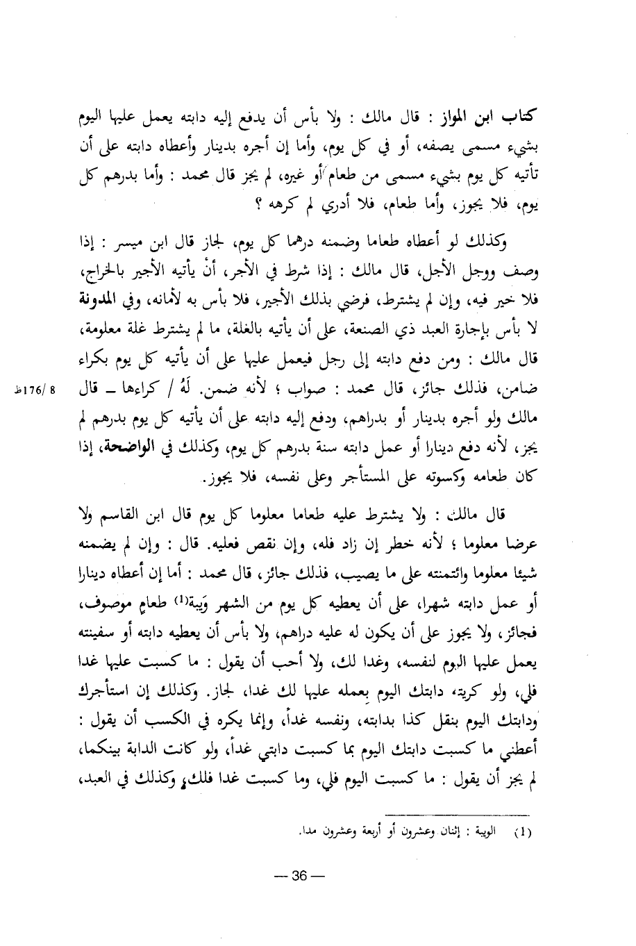 قال مالك: ولا يشترط عليه طعاما معلوما كل يوم قال ابن القاسم ولا عرضا معلوما؛ لأنه خطر إن زاد فله، وإن نقص فعليه. قال: وإن لم يضمنه شيئا معلوما وائتمنته على ما يصيب، فذلك جائز، قال محمد: أما إن أعطاه دينارا أو عمل دابته شهرا، على أن يعطيه كل يوم من الشهر ويبة طعام موصوف، فجائز، ولا يجوز على أن يكون له عليه دراهم، ولا بأس أن يعطيه دابته أو سفينته يعمل عليها اليوم لنفسه، وغدا لك، ولا أحب أن يقول: ما كسبت عليها غدا فلي، ولو كريته دابتك اليوم بعمله عليها لك غدا، لجاز. وكذلك إن استأجرك ودابتك اليوم بنقل كذا بدابته، ونفسه غدا، وإنما يكره في الكسب أن يقول: أعطني ما كسبت دابتك اليوم بما كسبت دابتي غدا، ولو كانت الدابة بينكما، لم يجز أن يقول: ما كسبت اليوم فلي، وما كسبت غدا فلك، وكذلك في العبد،