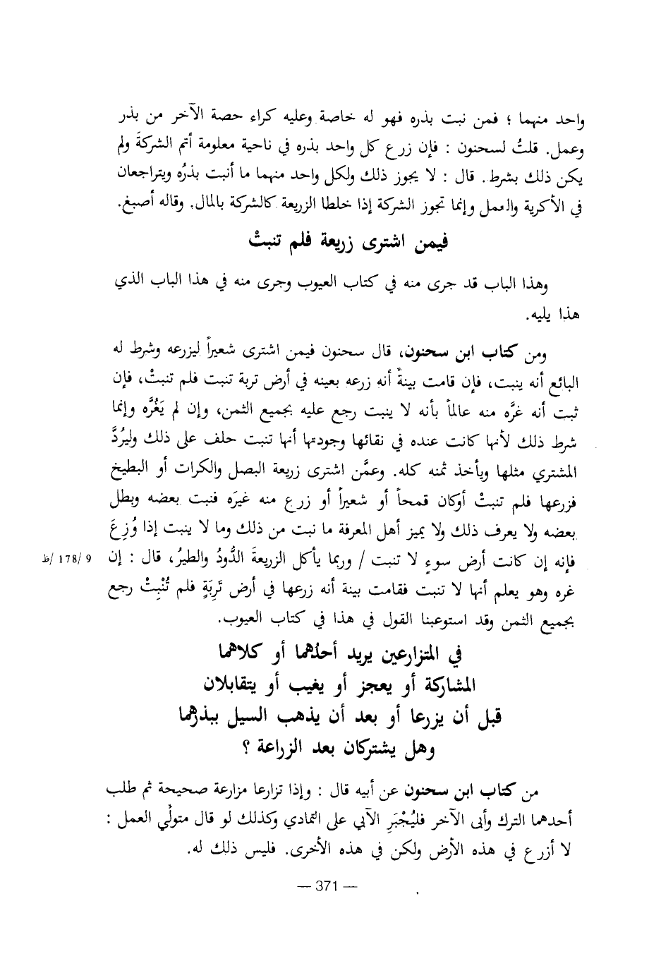 واحد منهما؛ فمن نبت بذره فهو له خاصة وعليه كراء حصة الآخر من بذر وعمل. قلت لسحنون: فإن زرع كل واحد بذره في ناحية معلومة أتم الشركة ولم يكن ذلك بشرط. قال: لا يجوز ذلك ولكل واحد منهما ما أنبت بذره ويتراجعان في الأكرية والعمل وإنما تجوز الشركة إذا خلطا الزريعة كالشريكة بالمال. وقاله أصبغ.