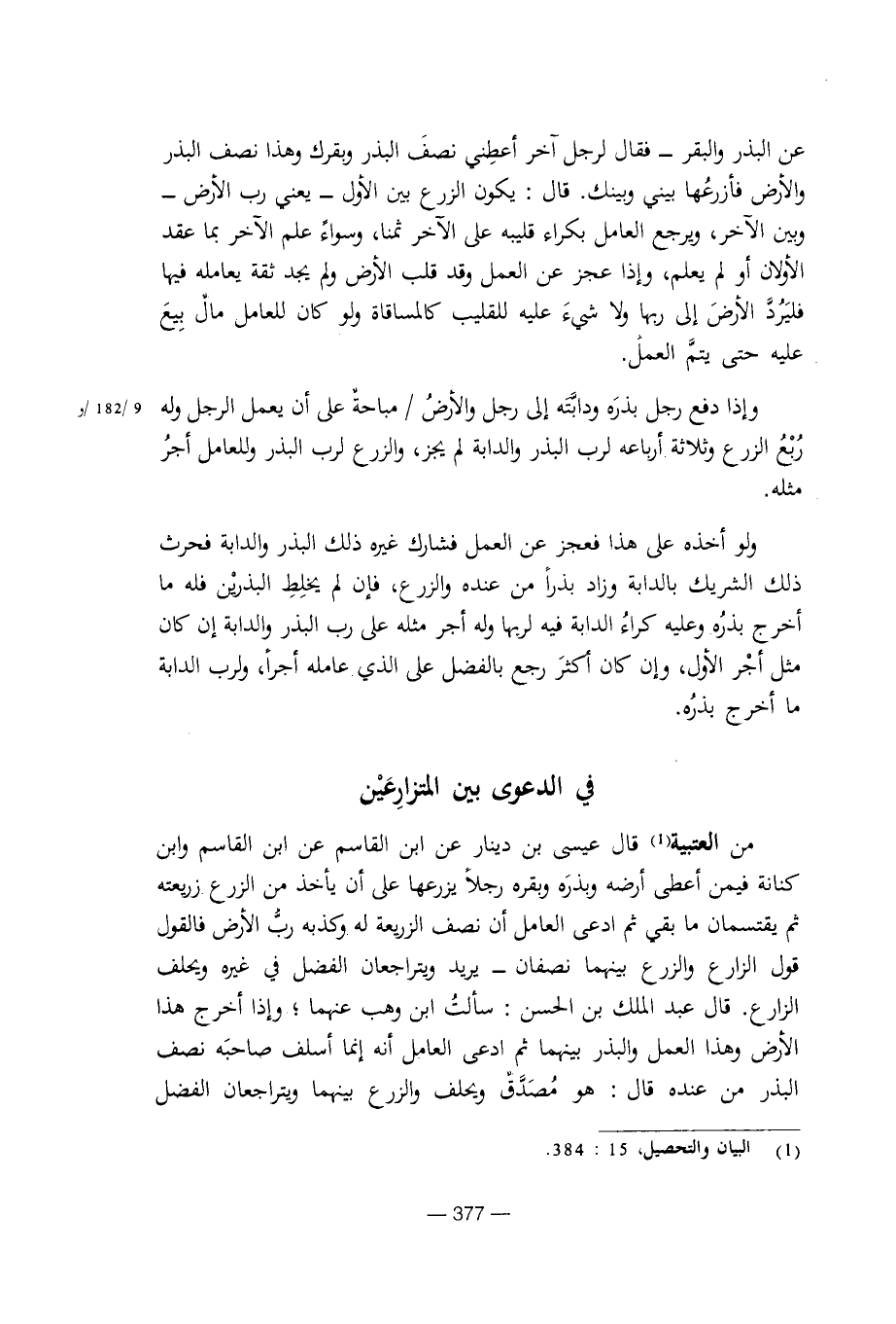 من العتبية قال عيسى بن دينار عن ابن القاسم وابن كنانة فيمن أعطى أرضه وبذره وبقره رجلا يزرعها على أن يأخذ من الزرع زريعته ثم يقتسمان ما بقي ثم ادعى العامل أن نصف الزريعة له وكذبه رب الأرض فالقول قول الزارع والزرع بينهما نصفان ـ يريد ويتراجعان الفضل في غيره ويحلف الزارع. قال عبد الملك بن الحسن: سألت ابن وهب عنهما؛ وإذا أخرج هذا الأرض وهذا العمل والبذر بينهما ثم ادعى العامل أنه إنما أسلف صاحبه نصف البذر من عنده قال: هو مصدق ويحلف والزرع بينهما ويتراجعان الفضل