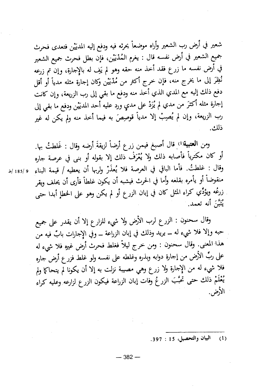 وقال سحنون: الزرع لرب الأرض ولا شيء للزرع إلا أن يقدر على جميع حبه وإلا فلا شيء له ـ يريد وذلك في إبان الزراعة ـ وفي الإجارات باب فيه من هذا المعنى. وقال سحنون: ومن خرج ليلا فغلط فحرث أرض غيره فلا شيء له على رب الأرض من إجارة دوابه وبذره وغلطه على نفسه ولو غلط فزرع أرض جاره فلا شيء له من الإجارة ولا زرع وهي مصيبة نزلت به إلا أن يكونا لم يتحاكما ولم يعلم ذلك حتى تحبب الزرع وفات إبان الزراعة فيكون الزرع لزارعه وعليه كراء الأرض.
