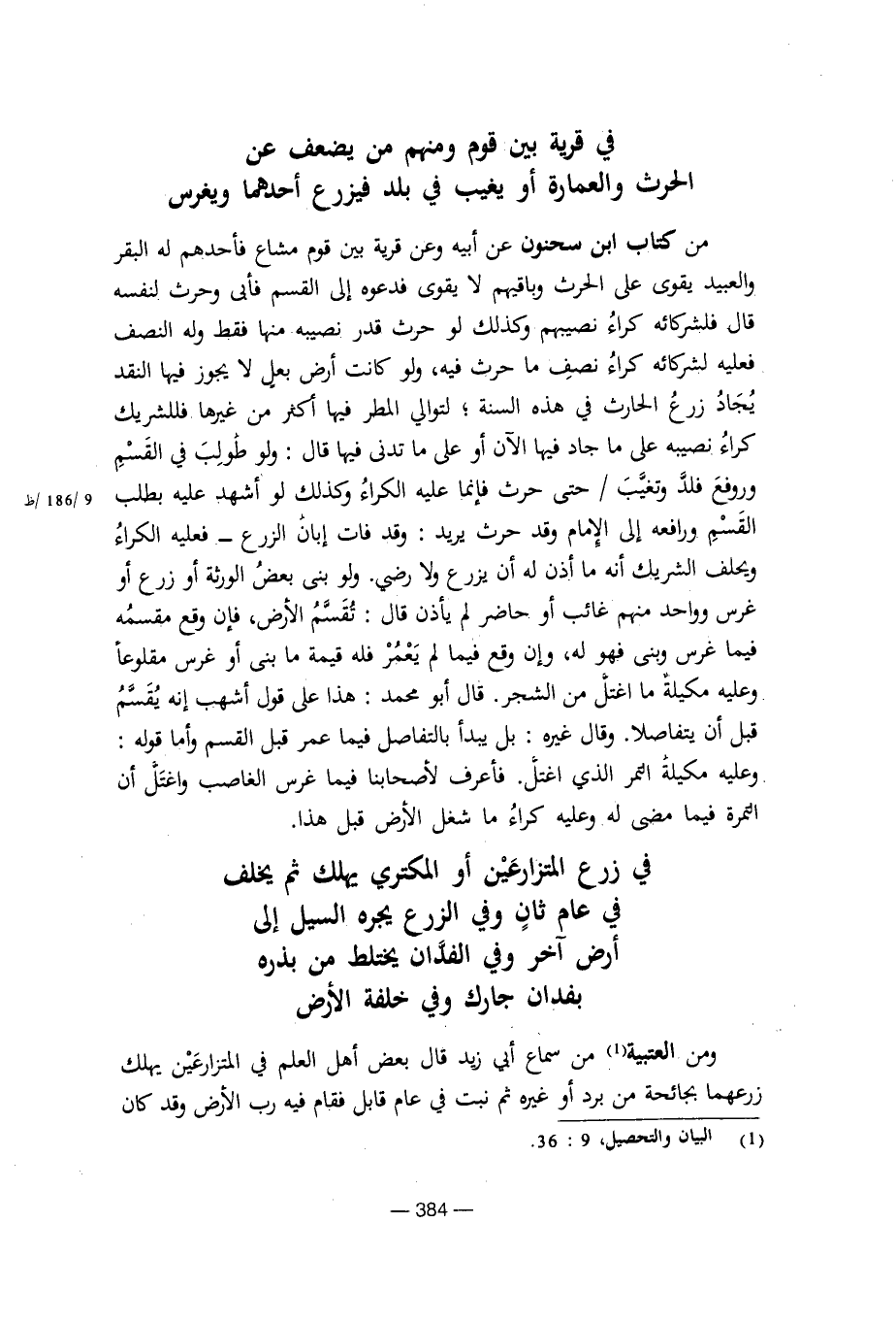 ومن العتبية من سماع أبي زيد قال بعض أهل العلم في المتزارعين يهلك زرعهما بجائحة من يرد أو غيره ثم نبت في عام قابل فقام فيه رب الأرض وقد كان