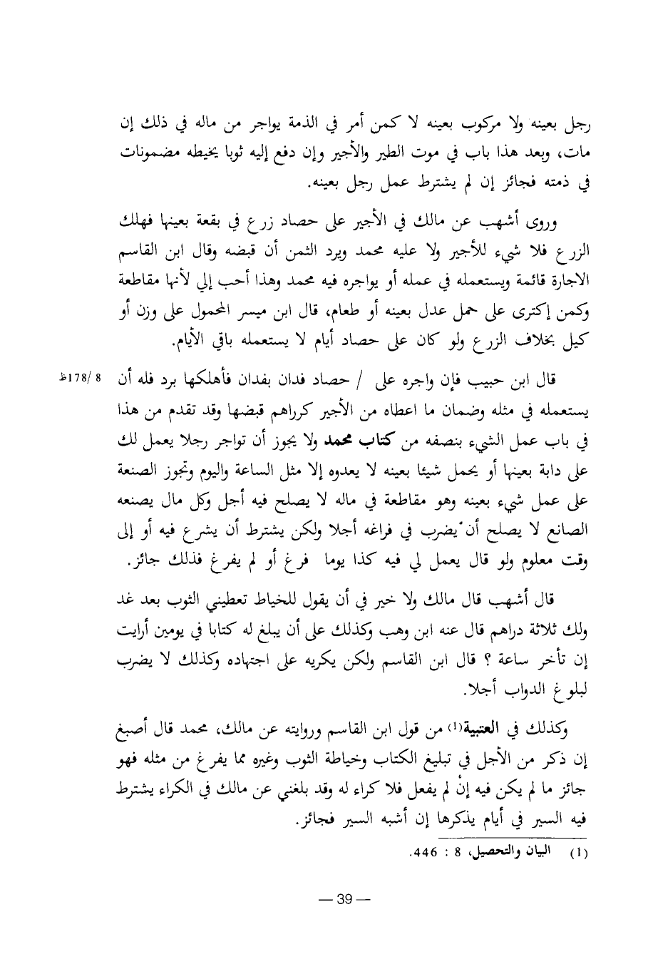 قال ابن حبيب فإن واجراه على / حصاد فدان بفدان فأهلكها برد فله أن يستعمله في مثله وضمان ما أعطاه من الأجير كرراهم قبضها وقد تقدم من هذا في باب عمل الشيء بنصفه من كتاب محمد ولا يجوز أن تواجر رجلا يعمل لك على دابة بعينها أو يحمل شيئا بعينه لا يعدوه إلا مثل الساعة واليوم وتجوز الصنعة على عمل شيء بعينه وهو مقاطعة في ماله لا يصلح فيه أجل وكل مال يصنعه الصانع لا يصلح أن يضرب في فراغه أجلا ولكن يشترط أن يشرع فيه أو إلى وقت معلوم ولو قال يعمل لي فيه كذا يوما أو فرغ أو لم يفرغ فذلك جائز.