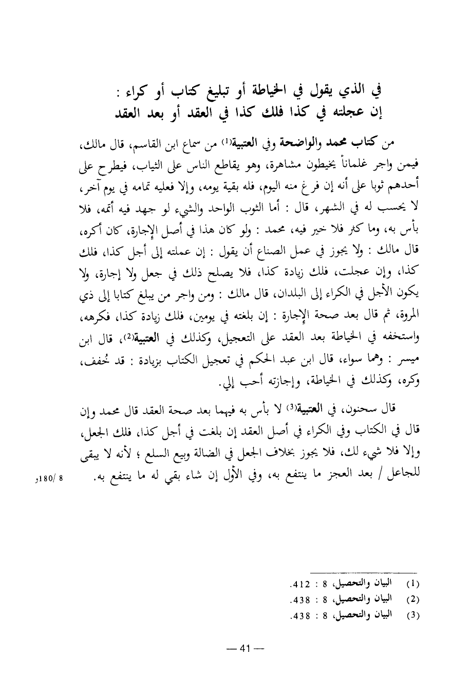 من كتاب محمد والواضحة وفي العتبية من سماع ابن القاسم، قال مالك، فيمن واجر غلمانا يخيطون مشاهرة، وهو يقاطع الناس على الثياب، فيطرح على أحدهم ثوبا على أنه إن فرغ منه اليوم، فله بقية يومه، إلا فعليه تمامه في آخر، لا يحسب له في الشهر، قال: أما الثوب الواحد الشيء لو جهد فيه أتمه، فلا بأس به، وما كثر فلا خير فيه، محمد: ولو كان هذا في أصل الإجارة، كان أكره، قال مالك: ولا يجوز في عمل الصناع أن يقول: إن عملته إلى أجل كذا، فلك كذا، وإن عجلت، فلك زيادة كذا، فلا يصلح ذلك في جعل ولا إجارة، ولا يكون الأجل في الكراء إلى البلدان، قال مالك: ومن واجر من يبلغ كتابا إلى ذي المروة، ثم قال بعد صحة الإجارة: إن بلغته في يومين، فلك زيادة كذا، فكرهه، واستخفه في الخياطة بعد العقد على التعجيل، وكذلك في العتبية، قال ابن ميسر: وهما سواء، قال ابن عبد الحكم في تعجيل الكتاب بزيادة: قد خفف، وكره، وكذلك في الخياطة، ولا إجازته أحب إلي.