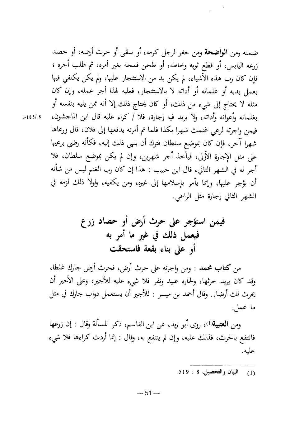 ضمنه ومن الواضحة ومن حفر لرجل كرمه، أو سقى أو حرث أرضه، أو حصد زرعه اليابس، أو قطع ثوبه وخاطه، أو طحن قمحه بغير أمره، ثم طلب أجره؛ فإن أن رب هذه الأشياء، لم يكن بد من الاستئجار عليها، ولم يكن يكتفي فيها بعمل يديه أو غلمانه أو أداته لا بالاستئجار، فعليه لهذا أجر عمله، وإن كان مثله لا يحتاج إلى شيء من ذلك، أو كان يحتاج ذلك إلا أنه ممن يليه بنفسه أو يغلمانه وأعوانه وأداته، ولا يريد فيه إجارة، فلا / كراء عليه قال ابن الماجشون، فيمن واجرته لرعي غنمك شهرا بكذا فلما تم أمرته يدفعها إلى فلان، قال ورعاها شهرا آخر، فإن كان بموضع سلطان فترك أن ينهى ذلك إليه، فكأنه رضي برعيها على مثل الإجارة الأولى، فيأخذ أجر شهرين، وإن لم يكن بموضع سلطان، فلا أجر له في الشهر الثاني، قال ابن حبيب: هذا إن كان رب الغنم ليس من شأنه أن يؤجر عليها، وإنما يأمر بإسلامها إلى غيره، ومن يكفيه، ولولا ذلك لزمه في الشهر الثاني إجارة مثل الراعي.