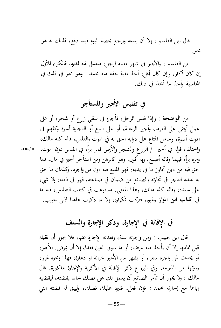 من الواضحة: وإذا فلس الرجل، فأجيره في سقي زرع أو شجر، أو على عمل أرض على الغرماء وأجير الرعاية، أو على البيع أو التجارة أسوة وكلهم في الموت أسوة، وحامل المتاع على دوابه أحق به في الموت والفلس، قاله كله مالك، واختلف قوله في أجير / الزرع والشجر والأرض قمر برأه في الفلس دون الموت، ومراه برأه فيهما وقاله أصبغ، وبه أقول، وهو كالرهن ومن استأجر أجيرا في مال، فما لحق فيه من دين تجاوز ما في يديه، فهو المتبع فيه دون من واجره، وكذلك ما لحق به عبده التاجر في تجارته والصانع من ضمان في صناعته، فهو في ذمته، ولا شيء على سيده، وقاله كله مالك، وهذا المعنى. مستوعب في كتاب التفليس، فيه ما في كتاب ابن المواز وغيره، فتركت تكراره، إلا ما ذكرت ها هنا لابن حبيب.