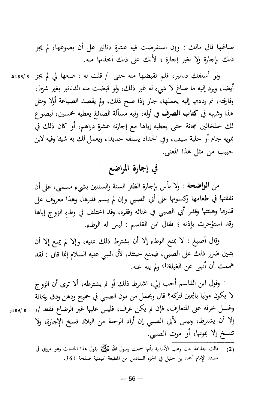 وقول ابن القاسم أحب إلي، اشترط ذلك أو لم يشترطه ألا ترى أن الزوج لا يكون موليا باليمين لتركه؟ قال ويحمل من مون الصبي في حميح ودهن ودق ريحانة وغسل خرفه على المتعارف، فإن لم يكن عرف، فليس عليها غير الرضاع فقط /، إلا أن يشترط، وليس لأبي الصبي إن أراد الرحلة من البلاد فسخ الإجارة، ولا تنسخ إلا بموتها، أو موت الصبي.