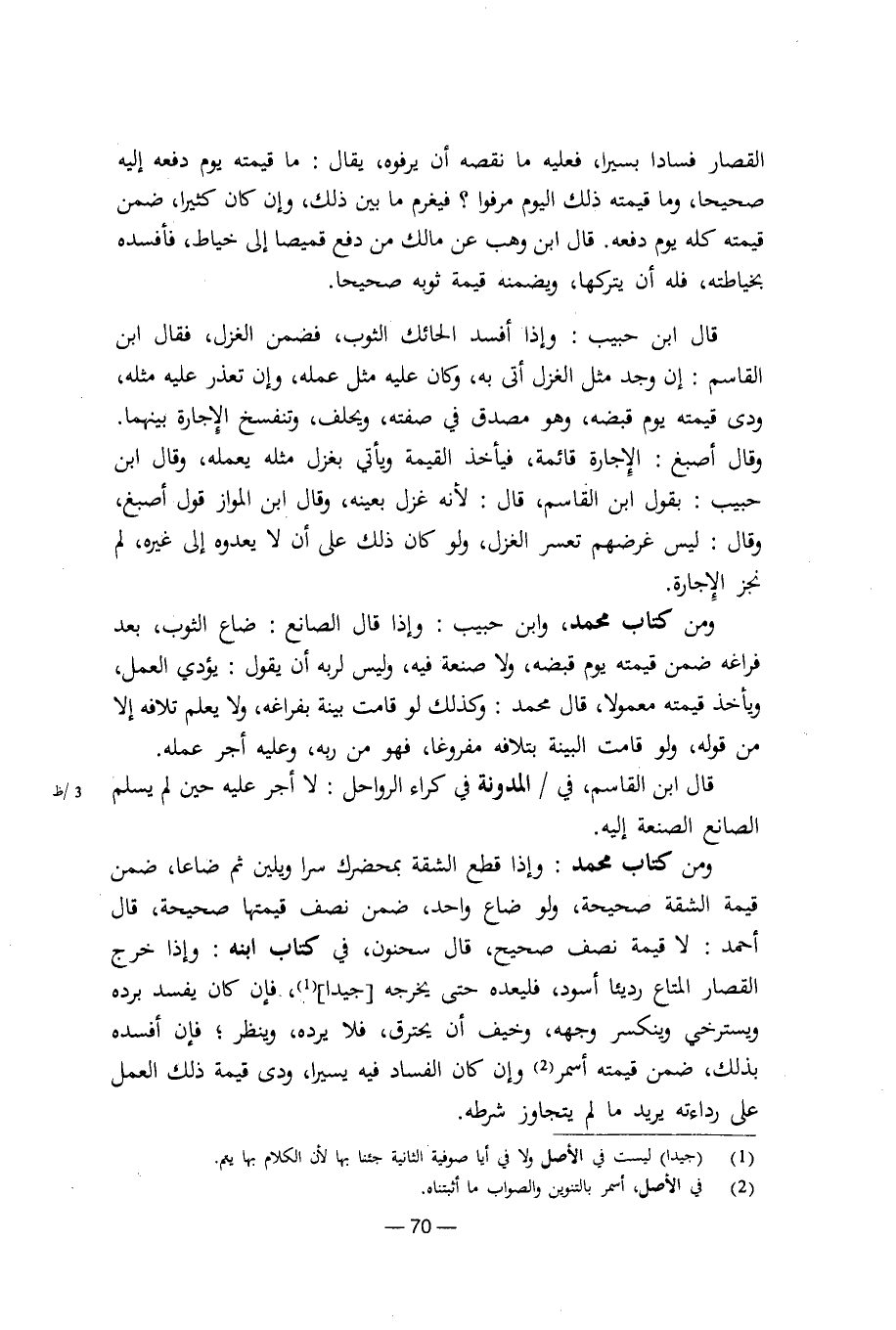 ومن كتاب محمد: وإذا قطع الشقة بمحضرك سرا ويلين ثم ضاعا، ضمن قيمة الشقة صحيحة، ولو ضاع واحد، ضمن نصف قيمتها صحيحة، قال أحمد: لا قيمة نصف صحيح، وقال سحنون، في كتاب ابنه: وإذا خرج القصار المتاع رديئا أسود، فليعده حتى يخرجه [جيدا]، فإن كان يفسد برده ويسترخي وينكسر وجهه، وخيف أن يحترق، فلا يرده، وينظر؛ فإن أفسده بذلك، ضمن قيمته أسمر وإن أن الفساد فيه يسيرا ودى قيمة ذلك العمل على رداءته يريد ما لم يتجاوز شرطه.