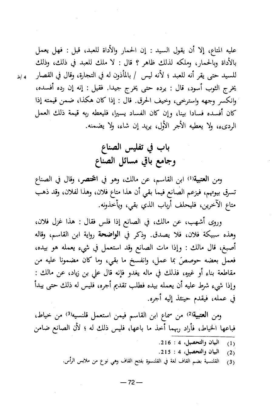 ومن العتبية من سماع ابن القاسم فيمن استعمل قلنسية من خياط، فباعها الخياط، فأراد ربهما أخذ ما باعها، فليس ذلك له؛ لأن الصانع ضامن