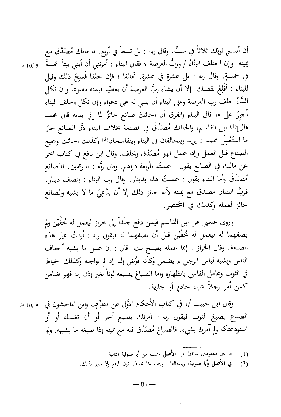 أن أنسخ ثوبك في ست. وقال ربه: بل تسعا في أربع. فالحائك مصدق مع يمينه. وإن اختلف البناء / ورب العرصة؛ فقال البناء: أمرتني أن أبني بيتا خمسة في خمسة. وقال ربه: بل عشرة في عشرة. تحالفا؛ فإن حلفا فسخ ذلك وقيل للبناء: أقلع نقضك. إلا أن يشاء رب العرصة أن يعطيه قيمه مقلوعا وإن نكل البناء حلف رب العرصة وعلى البناء أن يبني له على دعواه وإن نكل وحلف البناء أجبر على ما قال البناء والفرق أن الحائك صانع حائز لما [في يديه قال محمد قال] ابن القاسم والحائك مصدق في الصنعة بخلاف البناء لأن الصانع حاز ما استعمل محمد: يريد ويتحالفان في البناء ويتفاسخان وكذلك الحائك وجميع الصناع قبل العمل وإذا عمل فهو مصدق ويحلف. وقال ابن نافع في كتاب آخر عن مالك في الصانع يقول: عملته بأربعة دراهم. وقال ربه: بدرهمين. فالصانع مصدق وأما البناء يقول: عملت هذا بدينار. وقال رب البناء: بنصف دينار. فرب البنيان مصدق مع يمينه لأنه حائز ذلك إلا أن يدعي ما لا يشبه والصانع حائز لعمله وكذلك في المختصر.