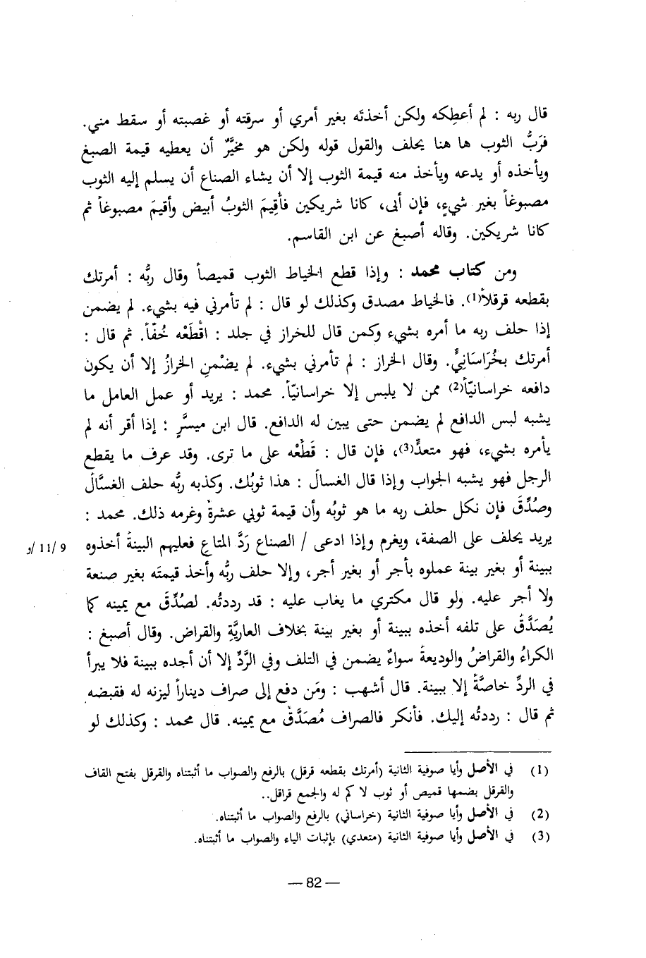 ومن كتاب محمد: وإذا قطع الخياط الثوب قميصا وقال ربه: أمرتك بقطعة قرقلا. فالخياط مصدق وكذلك لو قال: لم تأمرني فيه بشيء. لم يضمن إذا حلف ربه ما أمره بشيء وكمن قال للخراز في جلد: اقطعه خفا. ثم قال: أمرتك بخراساني. وقال الخراز: لم تأمرني بشيء. ولم يضمن الخراز إلا أن يكون دافعه خراسانيا ممن لا يلبس إلا خراسانيا. محمد: يريد أو عمل العامل ما يشبه لبس الدافع لم يضمن حتى يبين له الدافع. قال ابن ميسر: وقد عرف ما يقطع الرجل فهو يشبه الجواب وإذا قال الغسال: هذا ثوبك. وكذبه ربه حلف الغسال وصدق فإن نكل حلف ربه ما هو ثوبه وأن قيمة ثوبي عشرة وغرمه ذلك. محمد: يريد يحلف على الصفة، ويغرم إذا ادعى / الصناع رد المتاع فعليهم البينة أخذوه ببينة أو بغير بينة علموه بأجر أو بغير أجر، وإلا حلف ربه وأخذ قيمته بغير صنعة ولا أجر عليه. ولو قال مكتري ما يغاب عليه: قد رددته. لصدق مع يمينه كما يصدق على تلفه أخذه ببينة أو بغير بينة بخلاف العارية والقراض. وقال أصبغ: الكراء والقراض والوديعة سواء يضمن في التلف وفي الرد إلا أن أجده ببينة فلا يبرأ في الرد خاصة إلا ببينة. قال أشهب: ومن دفع إلى صراف دينارا ليزنه له فقبضه ثم قال: رددته إليك. فأنكر فالصراف مصدق مع يمينه. قال محمد: وكذلك لو