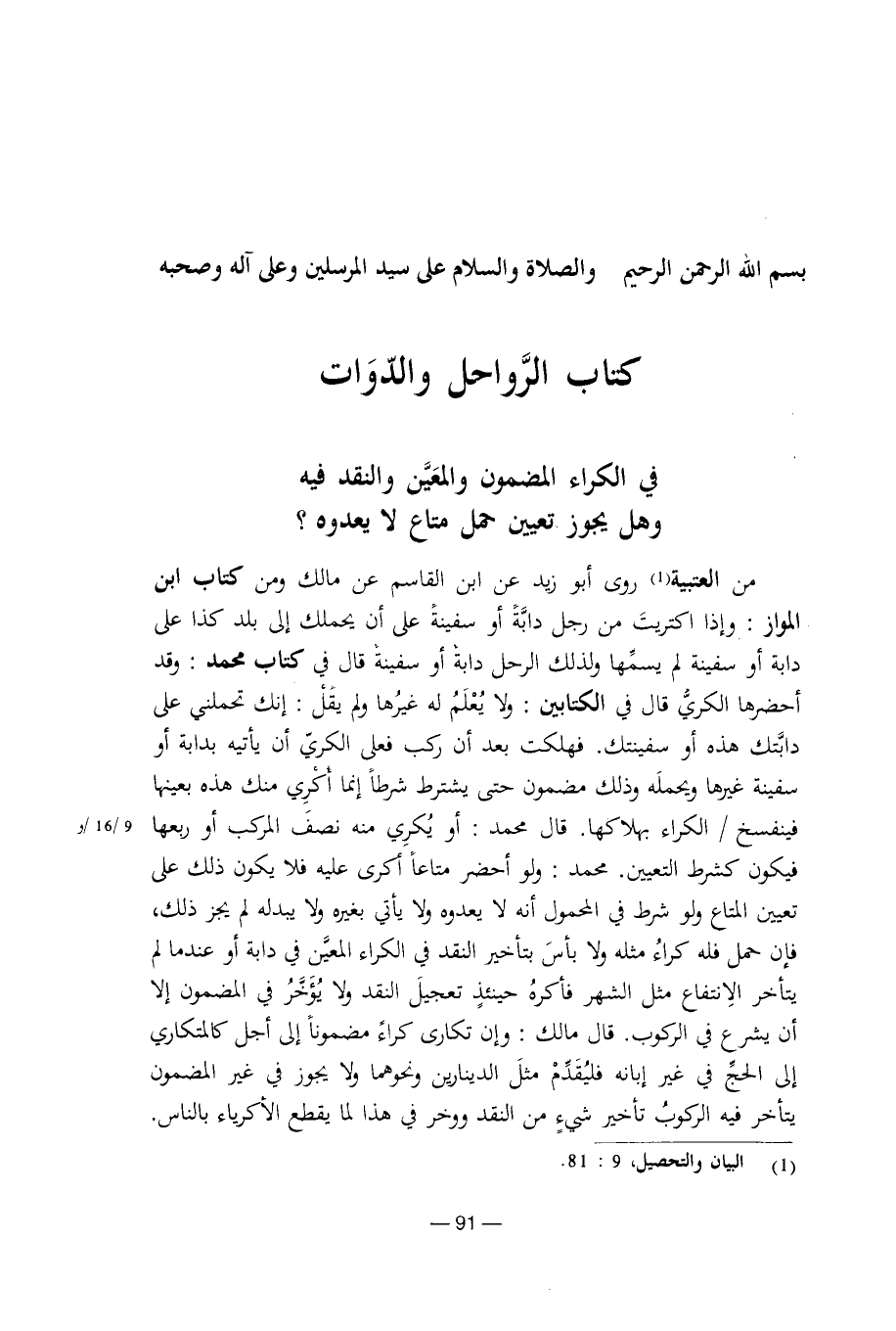 من العتبية روى أبو زيد عن ابن القاسم عن مالك ومن كتاب ابن المواز: وإذا اكتريت من رجل دابة أو سفينة على أن يحملك إلى بلد كذا على دابة أو سفينة لم يسمها ولذلك الرحل دابة أو سفينة قال في كتبا محمد: وقد أحضرها الكري قال في الكتابين: ولا يعلم له غيرها ولم يقل: إنك تحملني على دابتك هذه أو سفينتك. فهلكت بعد أن ركب فعلى الكرى أن يأتيه بدابة أو سفينة غيرها ويحمله وذلك مضمون حتى يشترط شرطا إنما أكري منك هذه بعينها فينفسخ / الكراء بهلاكها. قال محمد: أو يكري منه نصف المركب أو ربعها فيكون كشرط التعيين. محمد: ولو أحضر متاعا أكرى عليه فلا يكون ذلك على تعيين المتاع ولو شرط في المحمول أنه لا يعدوه ولا يأتي بغيره ولا يبدله لم يجز ذلك، فإن حمل فله كراء مثله ولا بأس بتأخير النقد في الكراء المعين في دابة أو عندما لم يتأخر الانتفاع مثل الشهر فأكره حينئذ تعجيل النقد ولا يؤخر في المضمون إلا أن يشرع في الركوب. قال مالك: وإن تكارى كراء مضمونا إلى أجل كالمتكاري إلى الحج في غير إبانة فليقدم مثل الدينارين ونحوهما ولا يجوز في غير المضمون يتأخر فيه الركوب تأخير شيء من النقد ووخر في هذا لما يقطع الأكرياء بالناس.
