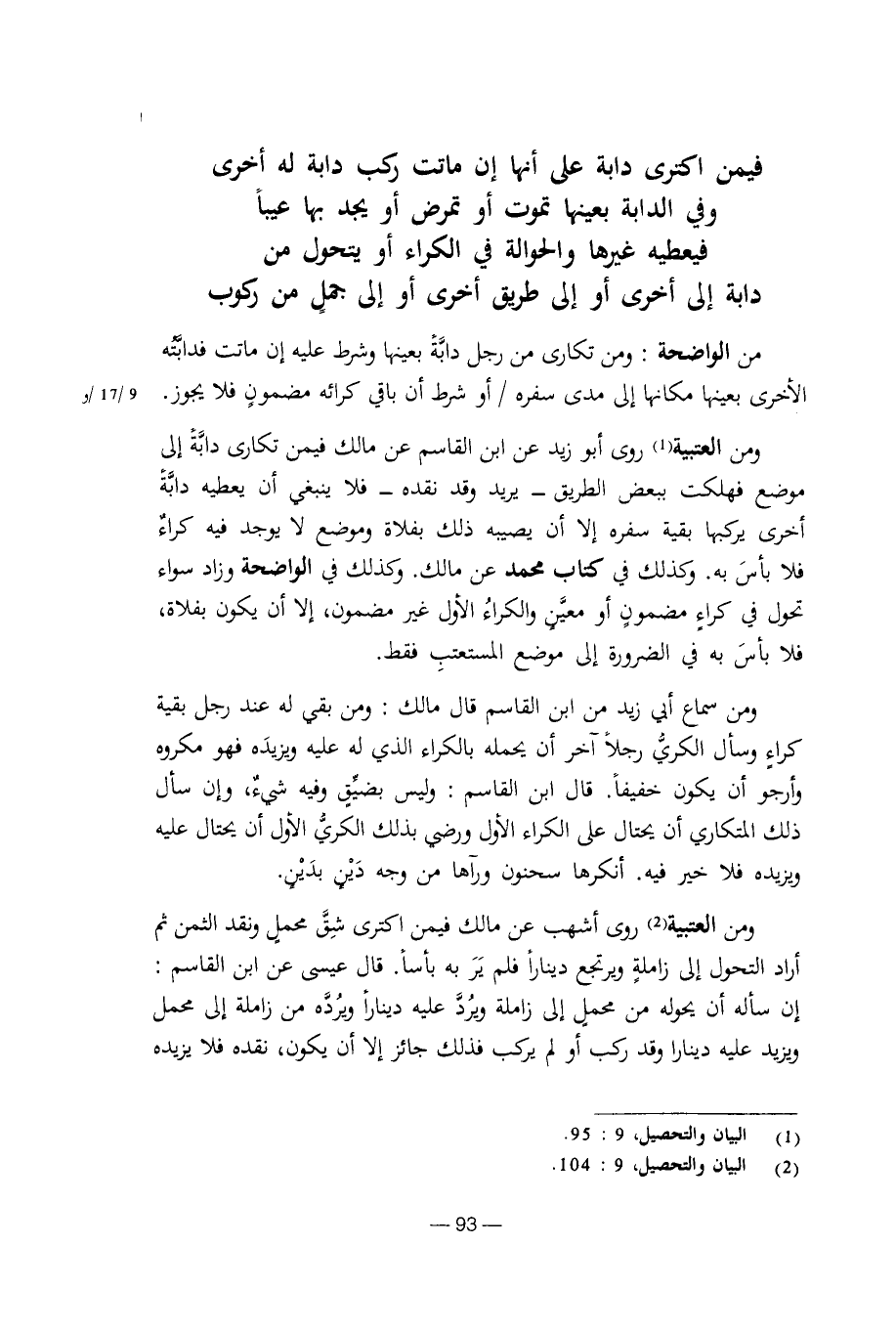 من الواضحة: ومن تكارى من رجل دابة بعينها وشرط عليه إن ماتت فدابته الأخرى بعينها مكانها إلى مدى سفره / أو شرط أن باقي كرائه مضمون فلا يجوز.