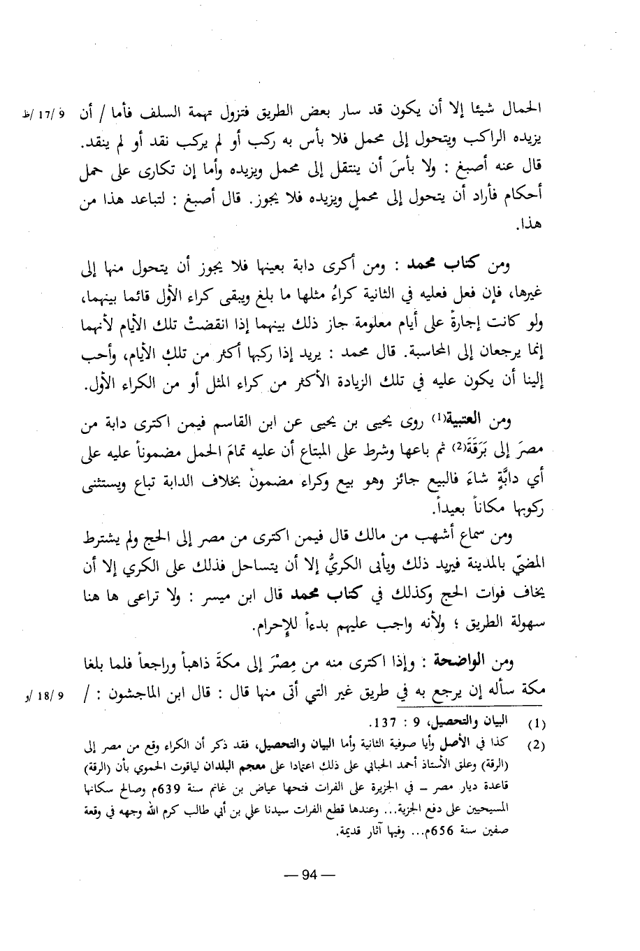 الحمال شيئا إلا أن يكون قد سار بعض الطريق فتزول تهمة السلف فأما / أن يزيده الراكب ويتحول إلى محمل فلا بأس به ركب أو لم يركب نقد أو لم ينقد. قال عنه أصبغ: ولا بأس أن ينتقل إلى محمل ويزيده وأما إن تكارى على حمل أحكام فأراد أن يتحول إلى محمل ويزيده فلا يجوز. قال أصبغ: لتباعد هذا من هذا.