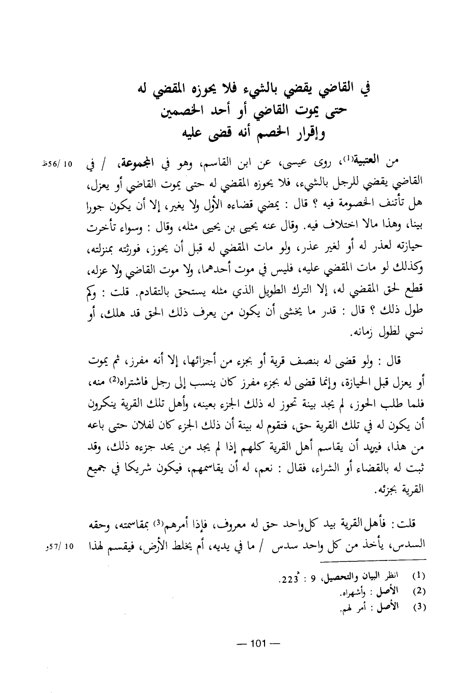 من العتبية، روى عيسى، عن ابن القاسم، وهو في المجموعة،/ في القاضي يقضي للرجل بالشيء، فلا يحوزه المقضي له حتى يموت القاضي أو يعزل، هل تأتنف الخصومة فيه؟ قال: يمضي قضاءه الأول ولا يغير، إلا أن يكون جورا بينا، وهذا ما لا اختلاف فيه. وقال عنه يحيى بن يحيى مثله، وقال: وسواء تأخرت حيازته لعذر له أو لغير عذر، ولو مات المقضي له قبل أن يحوز، فورثته بمنزلته، وكذلك لو مات المقضي عليه، فليس في موت أحدهما، ولا موت القاضي ولا عزله، قطع لحق المقضي له، إلا الترك الطويل الذي مثله يستحق بالتقادم. قلت: وكم طول ذلك؟ قال: قدر ما يخشى أن يكون من يعرف ذلك الحق قد هلك، أو نسي لطول زمانه.