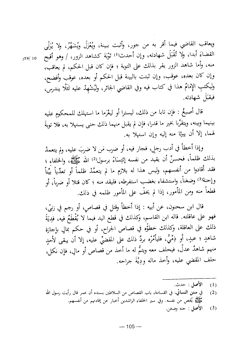 قال ابن سحنون، عن أبيه: إذا أخطأ وقتل في قصاص، أو رجم في زنى، فهو على عاقلته. قاله ابن القاسم، وكذلك في قطع اليد فيما لا يقطع فيه، فدية ذلك على العاقلة، وكذلك خطؤه في قصاص الجراح، أو في حكم بمال بإجازة شاهد، عبد، أو ذمي، فليأمره برد ذلك على المقضي عليه، إلا أن يبقى لأحد منهم شاهد عدل، فيحلف معه ويتم له ما أخذ من قصاص أو مال، فإن نكل، حلف المقضي عليه، وأخذ ماله ودية جراحه. [8/ 105]