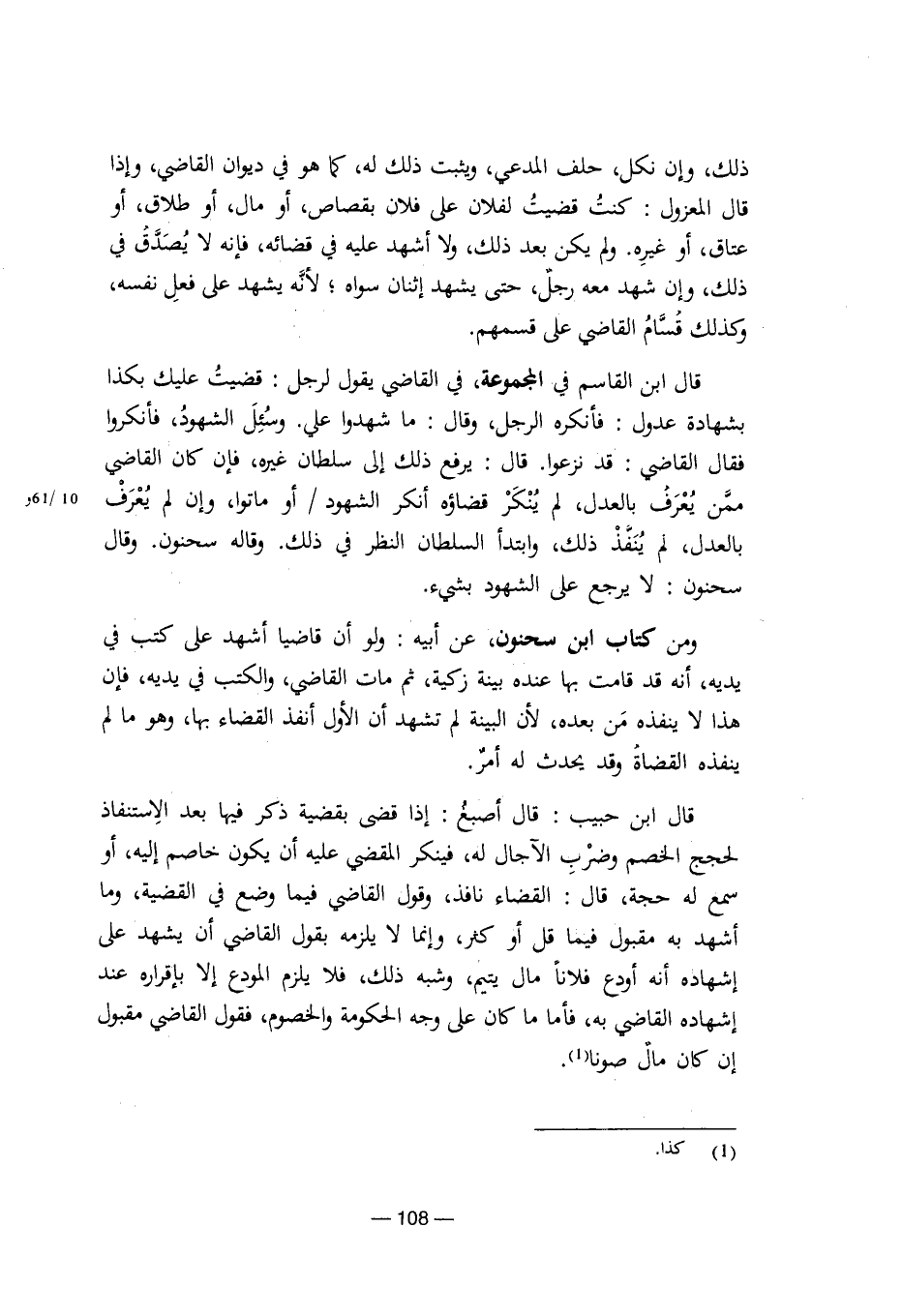 ومن كتاب ابن سحنون، عن أبيه: ولو أن قاضيا أشهد على كتب في يديه، أنه قد قامت بها عنده بينة زكية، ثم مات القاضي، والكتب في يديه، فإن هذا لا ينفذه من بعده، لأن البينة لم تشهد أن الأول أنفذ القضاء بها، وهو ما لم ينفذه القضاة وقد يحدث له أمر.