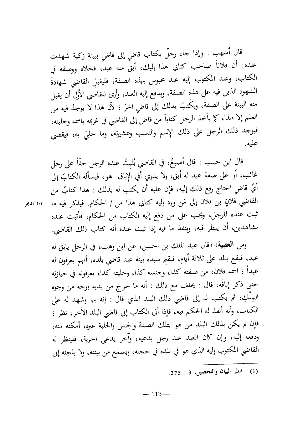 ومن العتبية قال عبد الملك بن الحسن، عن ابن وهب، في الرجل يابق له عبد، فيقع ببلد على ثلاثة أيام، فيقيم سيده بينةعند قاضي بلده، أنهم يعرفون له عبدا؛ اسمه فلان، من صفته كذا، وجنسه كذا، وحليته كذا، يعرفونه في حيازته حتى ذكر إباقه، قال: يحلف مع ذلك: أنه ما خرج من يديه بوجه من وجوه الملك، ثم يكتب له إلى قاضي ذلك البلد الذي قال: إنه بها وشهد له على الكتاب، وأنه أنفذ له الحكم فيه، فإذا أتى الكتاب إلى قاضي البلد الآخر، نظر؛ فإن لم يكن بذلك البلد من هو بتلك الصفة والجنس والحلية غيره، أمكنه منه، ودفعه إليه، وإن كان العبد عند رجل يدعيه، وآخر يدعي الحرية، فلينظر له القاضي المكتوب إليه الذي هو في بلده في حجته، ويسمع من بينته، ولا يلجئه إلى [8/ 113]