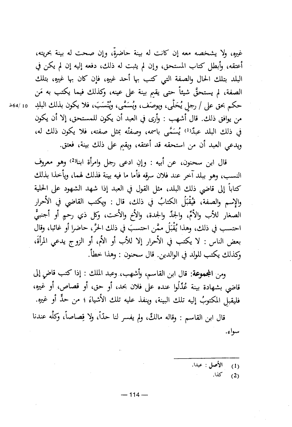 غيره، ولا يشخصه معه إن كانت له بينة حاضرة، وإن صحت له بينة بحريته، أعتقه، وأبطل كتاب المستحق، وإن لم يثبت له ذلك، دفعه إليه إن لم يكن في البلد بتلك الحال والصفة التي كتب بها أحد غيره، فإن كان بها غيره، بتلك الصفة، لم يستحق شيئا حتى يقيم بينة على عينه، وكذلك فيما يكتب به من حكم يحق على / رجل يحلي، ويوصف، ويسمى وينسب، فلا يكون بذلك البلد من يوافق ذلك. قال أشهب: وأرى في العبد أن يكون للمستحق، إلا أن يكون في ذلك البلد عبد يسمى باسمه، وصفته بمثل صفته، فلا يكون ذلك له، ويدعي العبد أن من استحقه قد أعتقه، ويقيم على ذلك بينة، فعتق.