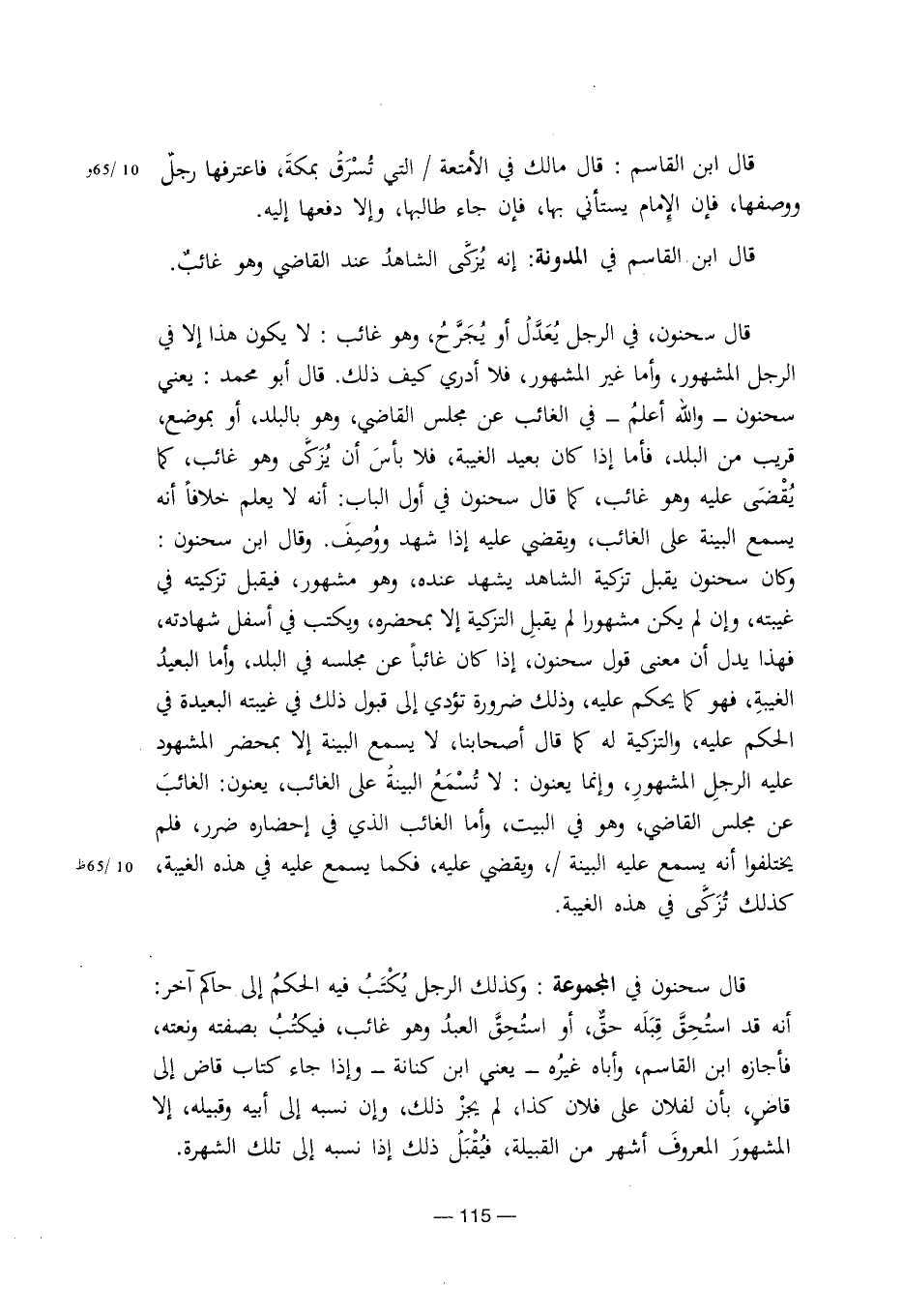 قال سحنون، في الرجل يعدل أو يجرح، وهو غائب: لا يكون هذا إلا في الرجل المشهور، وأما غير المشهور، فلا أدري كيف ذلك. قال أبو محمد: يعني سحنون –والله أعلم- في الغائب عن مجلس القاضي، وهو بالبلد، أو بموضع، قريب من البلد، فأما إذا كان بعيد الغيبة، فلا بأس أن يزكي وهو غائب، كما يقضي عليه وهو غائب، كما قال سحنون في أول الباب: أنه لا يعلم خلافا أنه يسمع البينة على الغائب، ويقضي عليه إذا شهد ووصف. وقال ابن سحنون: غيبته، وإن لم يكن مشهورا لم يقبل التزكية إلا بمحضره، ويكتب في أسفل شهادته، فهذا يدل على أن معنى قول سحنون، إذا كان غائبا عن مجلسه في البلد، وأما البعيد الغيبة، فهو كما يحكم عليه، وذلك ضرورة تؤدي إلى قبول ذلك في غيبته البعيدة في الحكم عليه، والتزكية له كما قال أصحابنا، لا يسمع البينة إلا بمحضر المشهود عليه الرجل المشهور، وإنما يعنون: لا تسمع البينة على الغائب، يعنون: الغائب عن مجلس القاضي، وهو في البيت، وأما الغائب الذي في إحضاره ضرر، فلم يختلفوا أنه يسمع عليه البينة/، ويقضي عليه فكما يسمع عليه في هذه الغيبة، كذلك تزكي في هذه الغيبة.