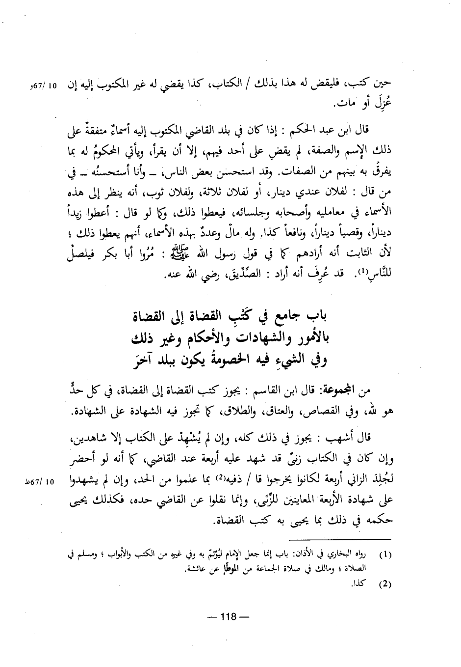 باب جامع في كتب القضاة إلى القضاة بالأمور والشهادات والأحكام وغير ذلك وفي الشيء فيه الخصومة يكون ببلد آخر