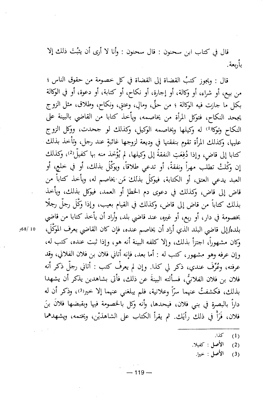 قال: ويجوز كتب القضاة إلى القضاة في كل خصومة من حقوق الناس؛ من بيع، أو شراء، أو وكالة، أو إجارة، أو نكاح، أو كتابة، أو دعوة، أو في الوكالة بكل ما جازت فيه الوكالة؛ من حق، ومال، وعتق، ونكاح، وطلاق، مثل الزوج يجحد النكاح، فتوكل المرأة من يخاصمه، ويأخذ كتابا من القاضي بالبينة على النكاح وتوكا له وكيلها ويخاصمه الوكيل، وكذلك لو جحدت، ووكل الزوج عليها، وكذلك المرأة تقوم بنفقتها في وديعة لزوجها غائبة عند رجل، وتأخذ بذلك كتابا إلى قاض، وإذا دفعت النفقة إلى وكيلها، لم يؤخذ منه بها كفيل، وكذلك إن تطلب مهرا ونفقته، أو تدعي طلاقا، ويوكل بذلك، أو في خلع، أو العبد يدعي العتق، أو الكتابة، فيوكل بذلك من يخاصم له، ويأخذ كتابا من قاض إلى قاض، وكذلك في دعوى دم الخطإ أو العمد، فيوكل بذلك، ويأخذ بذلك كتاب من قاض إلى قاض، وكذلك في القيام بعيب، وإذا وكل رجل رجلا بخصومة في دار، أو ربع، أو غيره، عند قاضي بلد، وأراد أن يأخذ كتابا من قاضي بلده/ إلى قاضي البلد الذي أراد أن يخاصم عنده، فإن كان القاضي يعرف الموكل، وكان مشهورا، اجتزأ بذلك، وإلا كلفه البينة أنه هو، وإذا ثبت عنده، كتب له، وإن عرفه وهو مشهور، كتب له: أما بعد، فإنه أتاني فلان بن فلان الفلاني، وقد عرفته، وعرف عندي، ذكر لي كذا. وإن لم يعرف كتب: أتاني رجل ذكر أنه فلان بن فلان الفلاني، فسألته البينة عن ذلك، فأتى بشاهدين يذكر أن يشهدا بذلك، فكشفت عنهما سرا وعلانية، فلم يبلغني عنهما إلا خير، وذكر أن له دارا بالبصرة في بني فلان، فيحدها، وأنه وكل بالخصومة فيها وبقبضها فلان بن فلان، فرأ في ذلك رأيك. ثم يقرأ الكتاب على الشاهدين، ويختمه، ويشهدهما [8/ 119]
