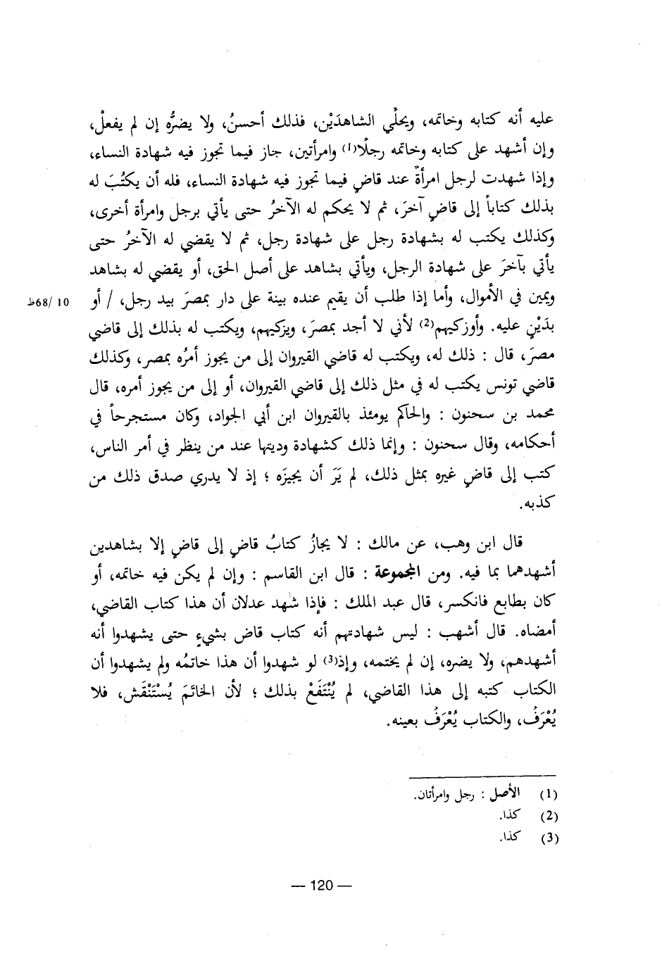 قال ابن وهب، عن مالك: لا يجاز كتاب قاض إلى قاض إلا بشاهدين أشهدهما بما فيه. ومن المجموعة: قال ابن القاسم: وإن لم يكن فيه خاتمه، أو كان بطابع فانكسر، قال عبد الملك: فإذا شهد عدلان أن هذا كتاب القاضي، أمضاه. قال أشهب: ليس شهادتهم أنه كتاب قاض بشيء حتى يشهدوا أنه أشهدهم، ولا يضره، إن لم يختمه، وإذ لو شهدوا أن هذا خاتمه ولم يشهدوا أن الكتاب كتبه إلى هذا القاضي، لم ينتفع بذلك؛ لأن الخاتم يستنقش، فلا يعرف، والكتاب يعرف بعينه. [8/ 120]