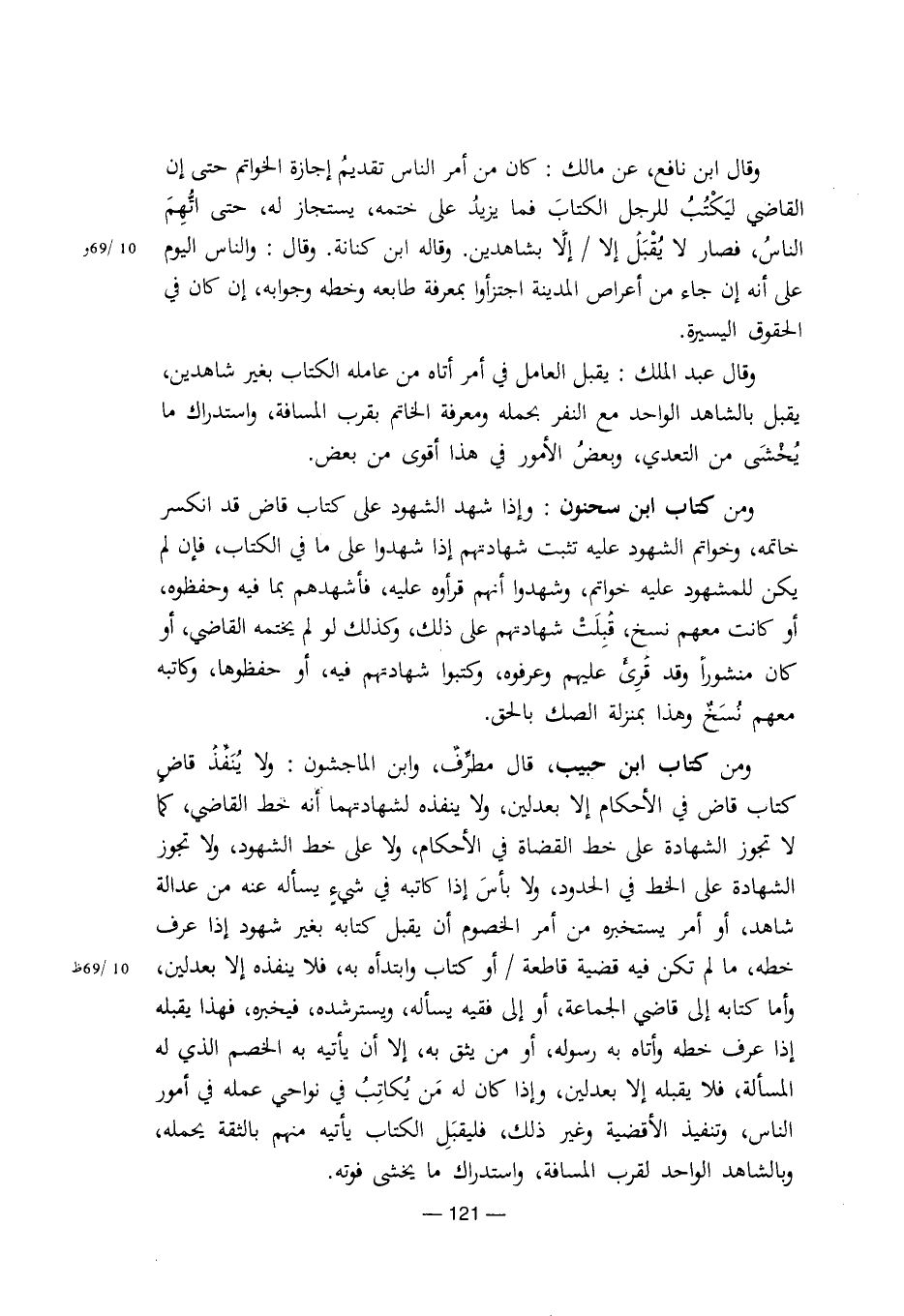 وقال ابن نافع، عن مالك: كان من أمر الناس تقديم إجازة الخواتم حتى إن القاضي ليكتب للرجل الكتاب فما يزيد على ختمه، يستجاز له، حتى اتهم الناس، فصار لا يقبل إلا/ إلا بشاهدين. وقاله ابن كنانة. وقال: والناس اليوم على أنه إن جاء من أعراص المدينة اجتزأوا بمعرفة طابعه وخطه وجوابه، إن كان في الحقوق اليسيرة.