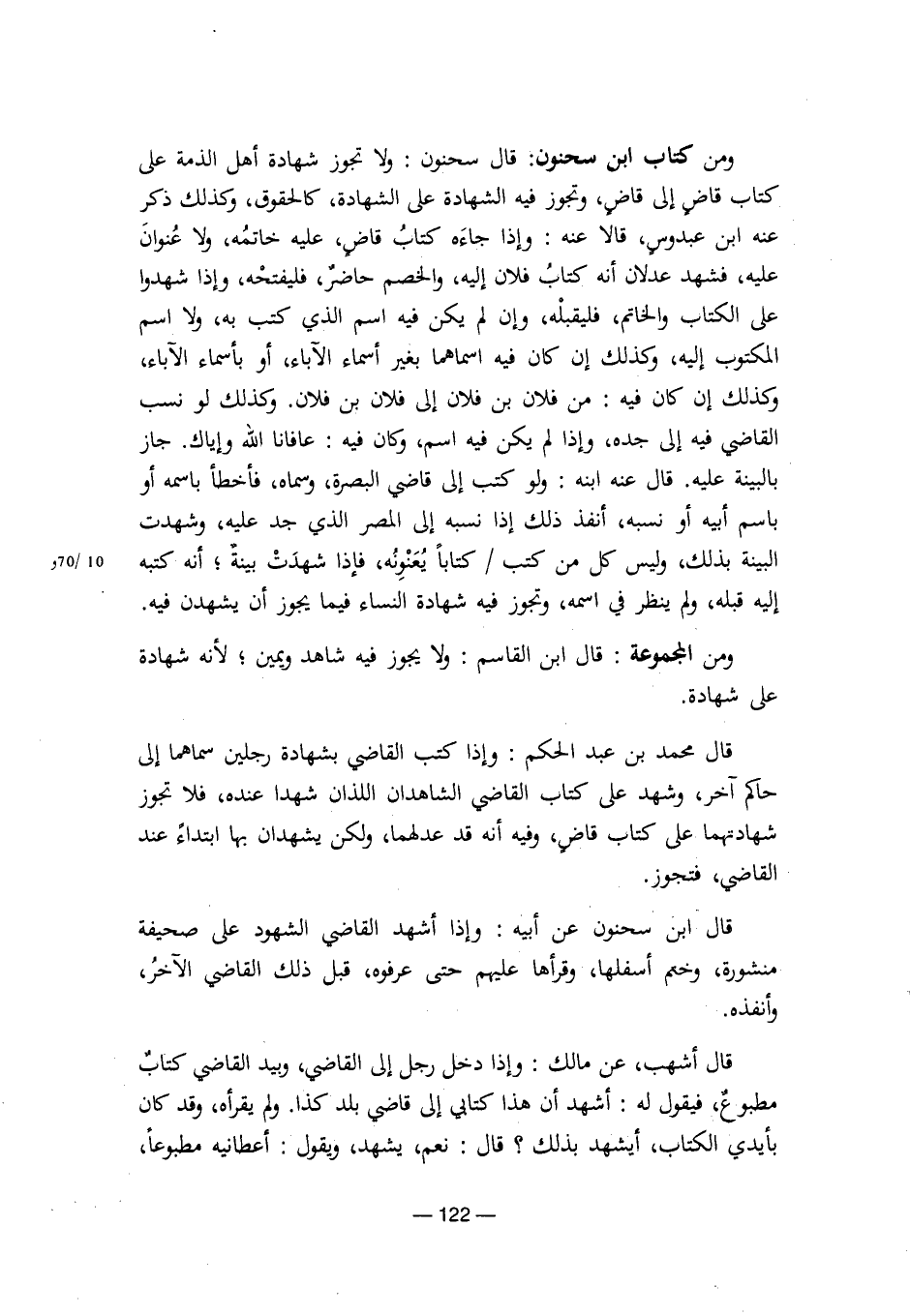 ومن كتاب ابن سحنون: قال سحنون: ولا تجوز شهادة أهل الذمة على كتاب قاض إلى قاض، وتجوز فيه الشهادة على الشهادة، كالحقوق، وكذلك ذكر عنه ابن عبدوس، قالا عنه: وإذا جاءه كتاب قاض، عليه خاتمه، ولا عنوان عليه، فشهد عدلان أنه كتاب فلان إليه، والخصم حاضر، فليفتحه، وإذا شهدوا على الكتاب والخاتم، فليقبله، وإن لم يكن فيه اسم الذي كتب به، ولا اسم المكتوب إليه، وكذلك إن كان فيه اسماهما بغير أسماء الآباء، أو بأسماء الآباء، وكذلك إن كان فيه: من فلان بن فلان إلى فلان بن فلان. وكذلك لو نسب القاضي فيه إلى جده، وإذا لم يكن فيه اسم، وكان فيه: عافانا الله وإياك. جاز بالبينة عليه، قال عنه ابنه: ولو كتب إلى قاضي البصرة، وسماه، فأخطأ باسمه أو باسم أبيه أو نسبه، أنفذ ذلك إذا نسبه إلى المصر الذي جد عليه، وشهدت البينة بذلك، وليس كل من كتب/ كتابا يعنونه، فإذا شهدت بينة؛ أنه كتبه إليه قبله، ولم ينظر في اسمه، وتجوز فيه شهادة النساء فيما يجوز أن يشهدن فيه.