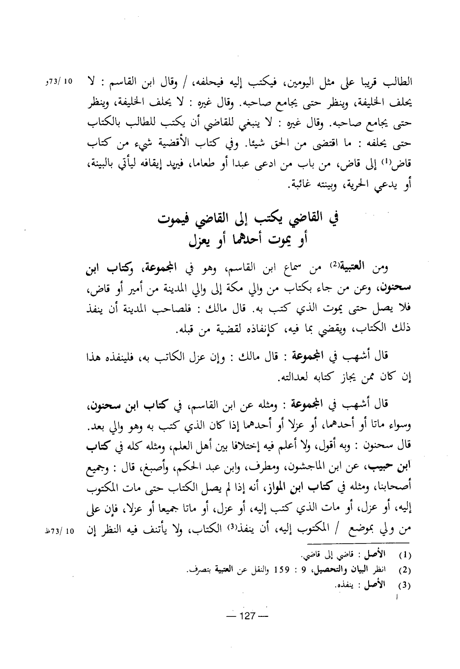 قال سحنون: وبه أقول، ولا أعلم فيه اختلافا بين أهل العلم، ومثله كله في كتاب ابن حبيب، عن ابن الماجشون، ومطرف، وابن عبد الحكم، وأصبغ، قال: وجميع أصحابنا، ومثله في كتاب ابن المواز، أنه إذا لم يصل الكتاب حتى مات المكتوب إليه، أو عزل، أو مات الذي كتب إليه، أو عزل، أو ماتا جميعا أو عزلا، فإن على من ولي بموضع/ المكتوب إليه، أن ينفذ الكتاب، ولا يأتنف فيه النظر إن [8/ 127]