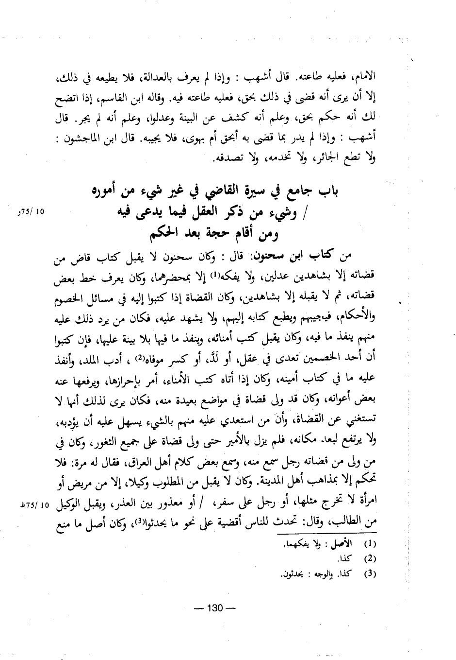 من كتاب ابن سحنون: قال: وكان سحنون لا يقبل كتاب قاض من قضاته إلا بشاهدين عدلين، ولا يفكه إلا بمحضرهما، وكان يعرف خط بعض قضاته، ثم لا يقبله إلا بشاهدين، وكان القضاة إذا كتبوا إليه في مسائل الخصوم والأحكام، فيجيبهم ويطبع كتابه إليهم، ولا يشهد عليه، فكان من يرد ذلك عليه منهم ينفذ ما فيه، وكان يقبل كتب أمنائه، وينفذ ما فيها بلا بينة عليها، فإن كتبوا أن أحد الخصمين تعدي في عقل، أو لد، أو كسر موفاه، أدب الملد، وأنفذ عليه ما في كتاب أمينه، وكان إذا أتاه كتب الأمناء، أمر بإحرازه، ويرفعها عنه بعض أعوانه، وكان قد ولى قضاة في مواضع بعيدة منه، فكان يرى لذلك أنها لا تستغني عن القضاة، وأن من استعدى عليه منهم بالشيء يسهل عليه أن يؤدبه، ولا يرتفع لبعد مكانه، فلم يزل بالأمير حتى ولى قضاة على جميع الثغور، وكان في من ولى من قضاته رجل سمع منه، وسمع بعض كلام أهل العراق، فقال له مرة: فلا تحكم إلا بمذاهب أهل المدينة وكان لا يقبل من المطلوب وكيلا، إلا من مريض أو امرأة لا تخرج مثلها، أو رجل على سفر،/ أو معذور بين العذر، ويقبل الوكيل من الطالب، وقال: تحدث للناس أقضية على نحو ما يحدثوا، وكان أصل ما منع [8/ 130]