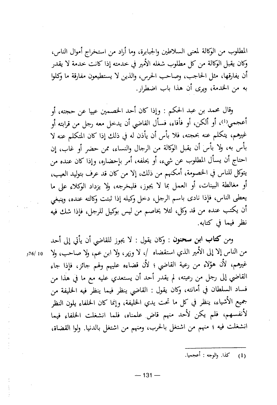 ومن كتاب ابن سحنون: وكان يقول: لا يجوز للقاضي أن يأتي إلى أحد من الناس إلا إلى الأمير الذي استقضاه/، لا وزير، ولا ابن عم، ولا صاحب، ولا غيرهم، لأن هؤلاء من رعية القاضي؛ لأن قضاءه عليهم ولهم جائز، فإذا جاء القاضي إلى رجل من رعيته، لم يقدر أحد أن يستعدي عليه مع م في هذا من فساد السلطان في أمانته، وكان يقول: القاضي ينظر فيما ينظر فيه الخليفة من جميع الأشياء، ينظر في كل ما تحت يدي الخليفة، وإنما كان الخلفاء يلون النظر لأنفسهم، فلم يكن لأحد منهم قاض علمناه، فلما انشغلت الخلفاء فيما انشغلت فيه؛ منهم من اشتغل بالحرب، ومنهم من اشتغل بالدنيا. ولوا القضاة، [8/ 131]