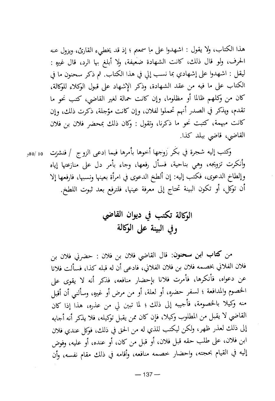 هذا الكتاب، ولا يقول: اشهدوا على ما سمعتم؛ إذ قد يخطئ القارئ، ويزول عنه الحرف، ولو قال ذلك، كانت الشهادة ضعيفة، ولا أبلغ بها الرد، قال غيره: ليقل: اشهدوا على إشهادي بما نسب إلى في هذا الكتاب. ثم ذكر سحنون ما في الكتاب على ما فيه من عقد الشهادة، وذكر الإشهاد على قبول الوكلاء للوكالة، كان من وكلهم ظالما أو مظلوما، وإن كانت حمالة لغير القاضي، كتب نحو ما تقدم، ويذكر في الصدر أنهم تحملوا لفلان، وإن كانت مؤجلة، ذكرت ذلك، وإن كانت مبهمة، كتبت نحو ما ذكرنا، وتقول: وكان ذلك بمحضر فلان بن فلان القاضي، قاضي ببلد كذا.