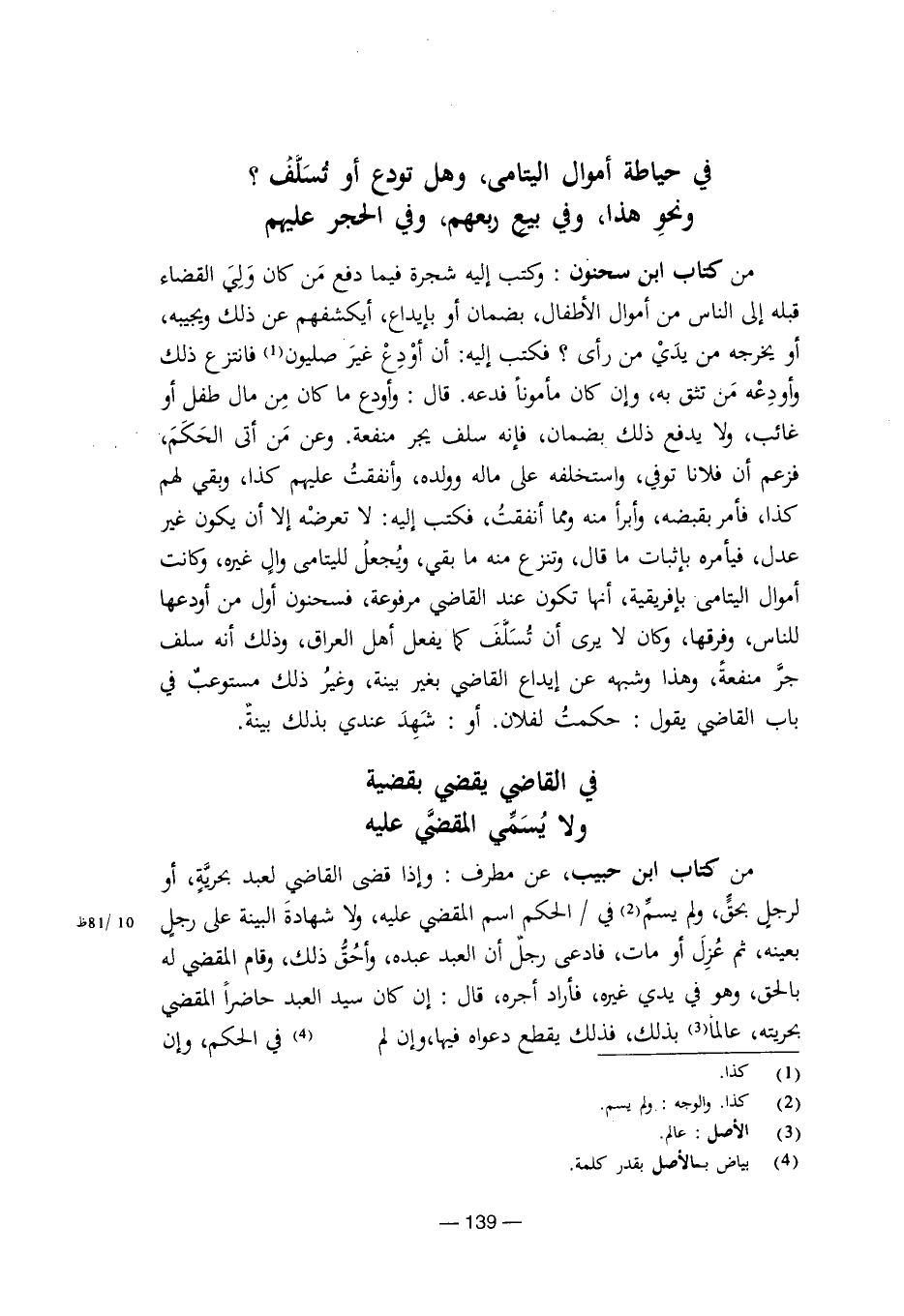 من كتاب ابن سحنون: وكتب إليه شجرة فيما دفع من كان ولي القضاء قبله إلى الناس من أموال الأطفال، بضمان أو بإيداع، أيكشفهم عن ذلك ويجيبه، أو يخرجه من يدي من رأى؟ فكتب إليه: أن أودع غير صليون فانتزع ذلك وأودعه من تثق به، وإن كان مأمونا فدعه. قال: وأودع ما كان من مال طفل أو غائب، ولا يدفع ذلك بضمان، فإنه سلف يجر منفعة. وعن من أتى الحكم، فزعم أن فلان توفي، واستخلفه على ماله وولده، وأنفقت عليهم كذا، وبقي لهم كذا، فأمر بقبضه، وأبرأ منه ومما أنفقت، فكتب إليه: لا تعرضه إلا أن يكون غير عدل، فيأمره بإثبات ما قال، وتنزع منه ما بقي، ويجعل لليتامى وال غيره، وكانت أموال اليتامى بإفريقية، أنها تكون عند القاضي مرفوعة، فسحنون أول من أودعها للناس، وفرقها، وكان لا يرى أن تسلف كما يفعل أهل العراق، وذلك أنه سلف جر منفعة، وهذا وشبهه عن إيداع القاضي، بغير بينة، وغير ذلك مستوعب في باب القاضي يقول: حكمت لفلان. أو: شهد عندي بذلك بينة.